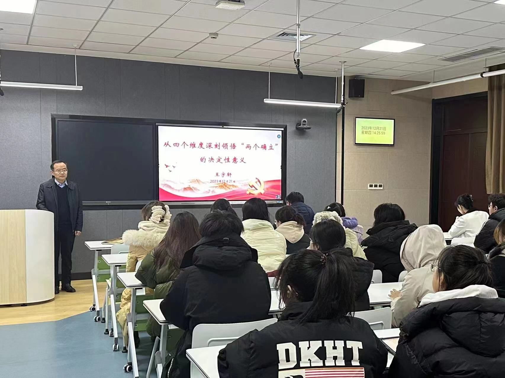 为深入学习贯彻习近平新时代中国特色社会主义思想,加强思想政治引领,凝聚青年紧跟党走,12月21日,校(院)党委委员、副校(院)长王宇轩在教学南楼C2018为beat365在线唯一官网学生干部骨干讲专题思政课。beat365在线唯一官网党委书记张延玲主持活动。 王宇轩以《从四个维度深刻领悟“两个确立”的决定性意义》为题,围绕深刻领悟“两个确立”的理论必然、历史必然、现实必然以及实践必然四个维度对“两个确立”的科学内涵和决定性意义...