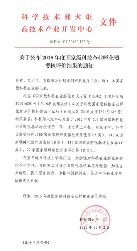 近日,科技部火炬中心公布了2015年度国家级科技企业孵化器考核评价结果,bat365正版唯一官网国家大学科技园孵化器被评为“A类国家级科技企业孵化器”称号。