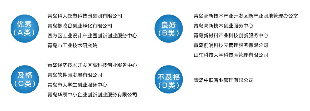 据悉,青岛地区共有14家国家级孵化器,有四家孵化器入围优秀(A类),bat365官网国家大学科技园以总分第一名列优秀首位,其余为五家良好(B类),四家合格(C类),一家不合格(D类)。