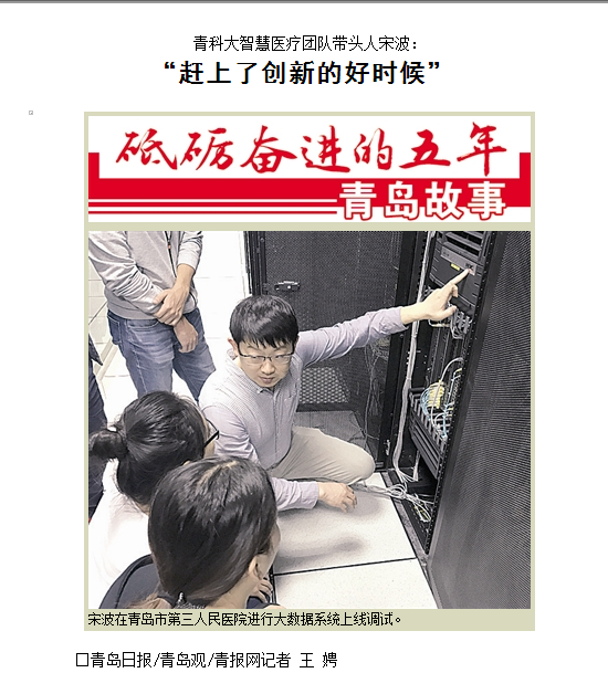 细心的市民会发现,近两三年来,在市中心医院、市妇儿医院等岛城各大医院的医护人员手中逐渐多了一套移动医护设备。使用这套设备,扫描一下患者的腕带或者读取一下医疗卡,就能采集到患者当前的生命体征指数,在住院期间吃什么药、打什么针、做什么检查,也都实现了智能化跟踪。这一移动医疗技术的研发和推向市场就来自于宋波和他的团队。