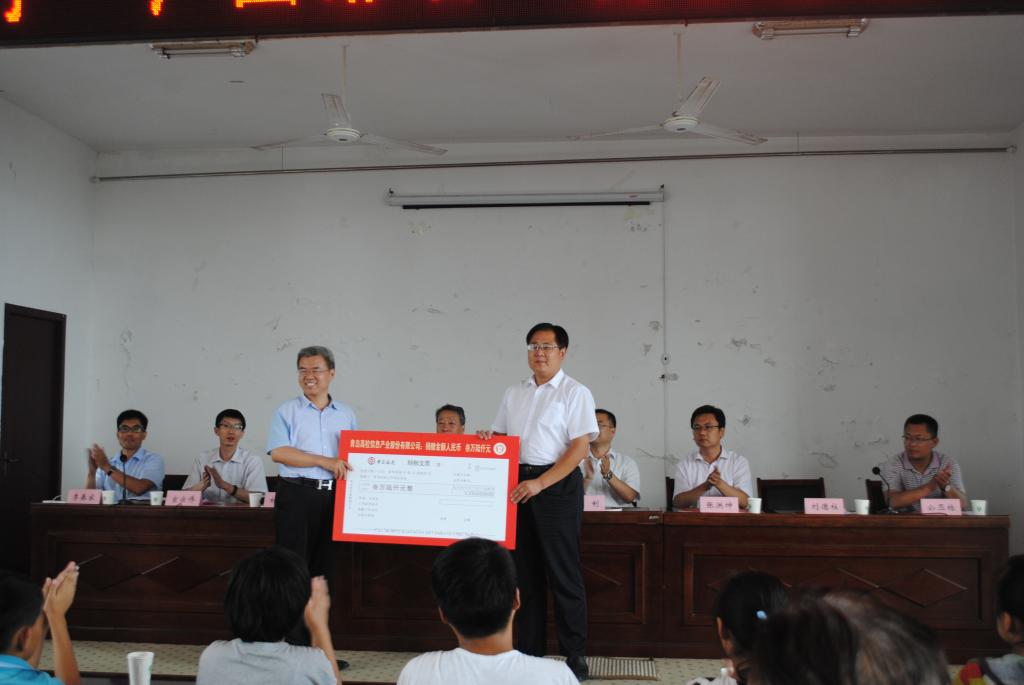 座谈会后举行了“产业助坦•高信基金”捐赠仪式,王文哲、盛利共同为高信基金揭牌。科技产业党总支书记张洪坤介绍了“高信基金”的有关情况。高信基金出资方、青岛高校信息产业股份有限公司董事长兼总经理杜长河向坦埠镇捐赠了36000元爱心款,坦埠镇党委书记刘德柱接受了捐赠支票。