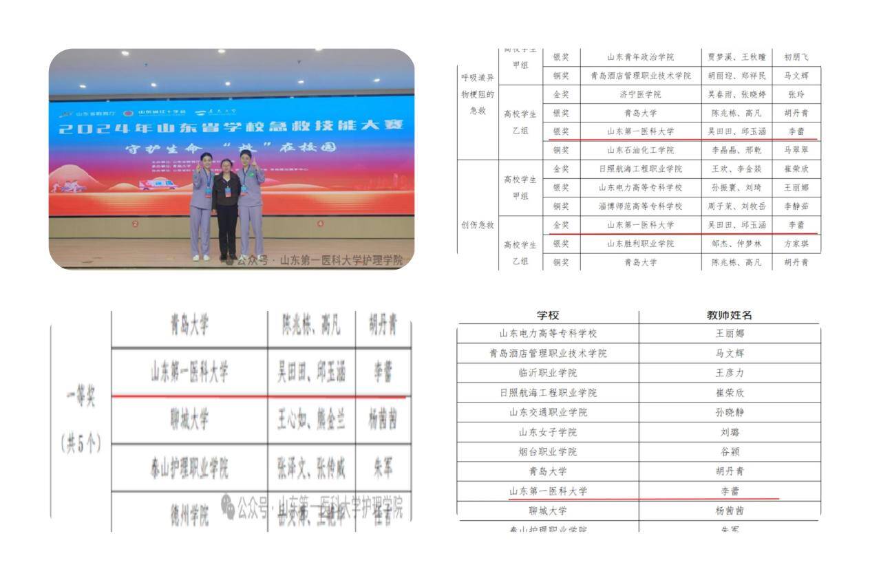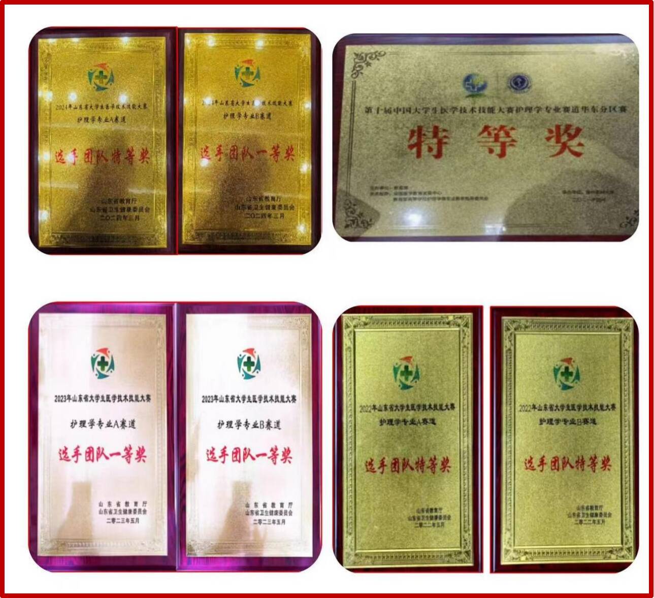 立德树人,硕果累累。学院荣获“全国五四红旗团支部”“山东省共青团先进集体”荣誉称号,连续5年荣获中国南丁格尔志愿护理服务“先进集体”,获评“全国践行社会主义核心价值观示范团支部”;护理学子先后荣获“中国第十届大学生年度人物入围奖”“中国大学生自强之星提名奖”“中国电信奖学”“鲁最美青年”等荣誉称号。2021年,荣获第十届中国大学生医学技术技能大赛护理专业赛道华东分区赛特等奖、全国赛银奖;2022年,荣获山东省大学生医学技术技能大赛团体金奖,A、B赛道特等奖;2023年,荣获山东省大学生医学技术技能大赛 A、B 赛道一等奖;2024年再获山东省大学生医学技术技能大赛A赛道特等奖、B 赛道一等奖,并斩获4项单项金奖,优秀指导教师团队奖;在山东省学校急救技能大赛中,由beat3652名学生组成的参赛团队荣获高校学生乙组团队一等奖,并获得创伤急救金奖、呼吸道异物梗阻急救银奖的优异成绩。