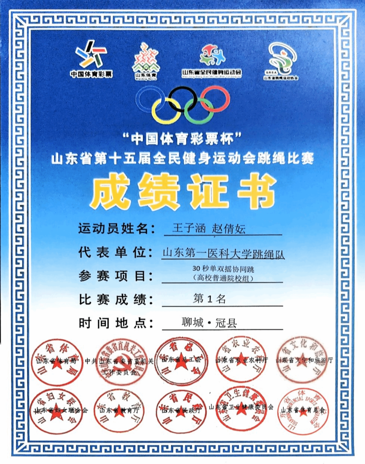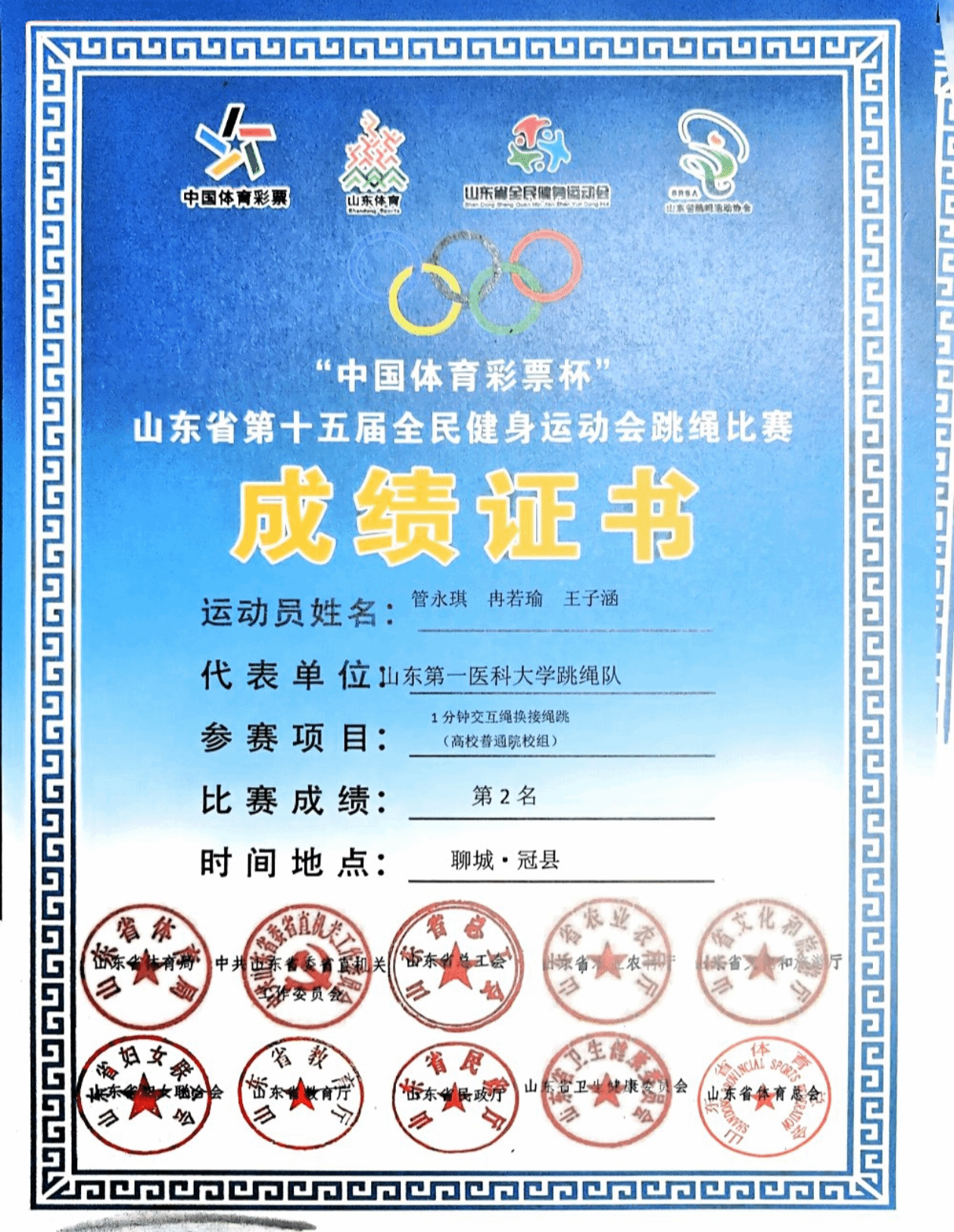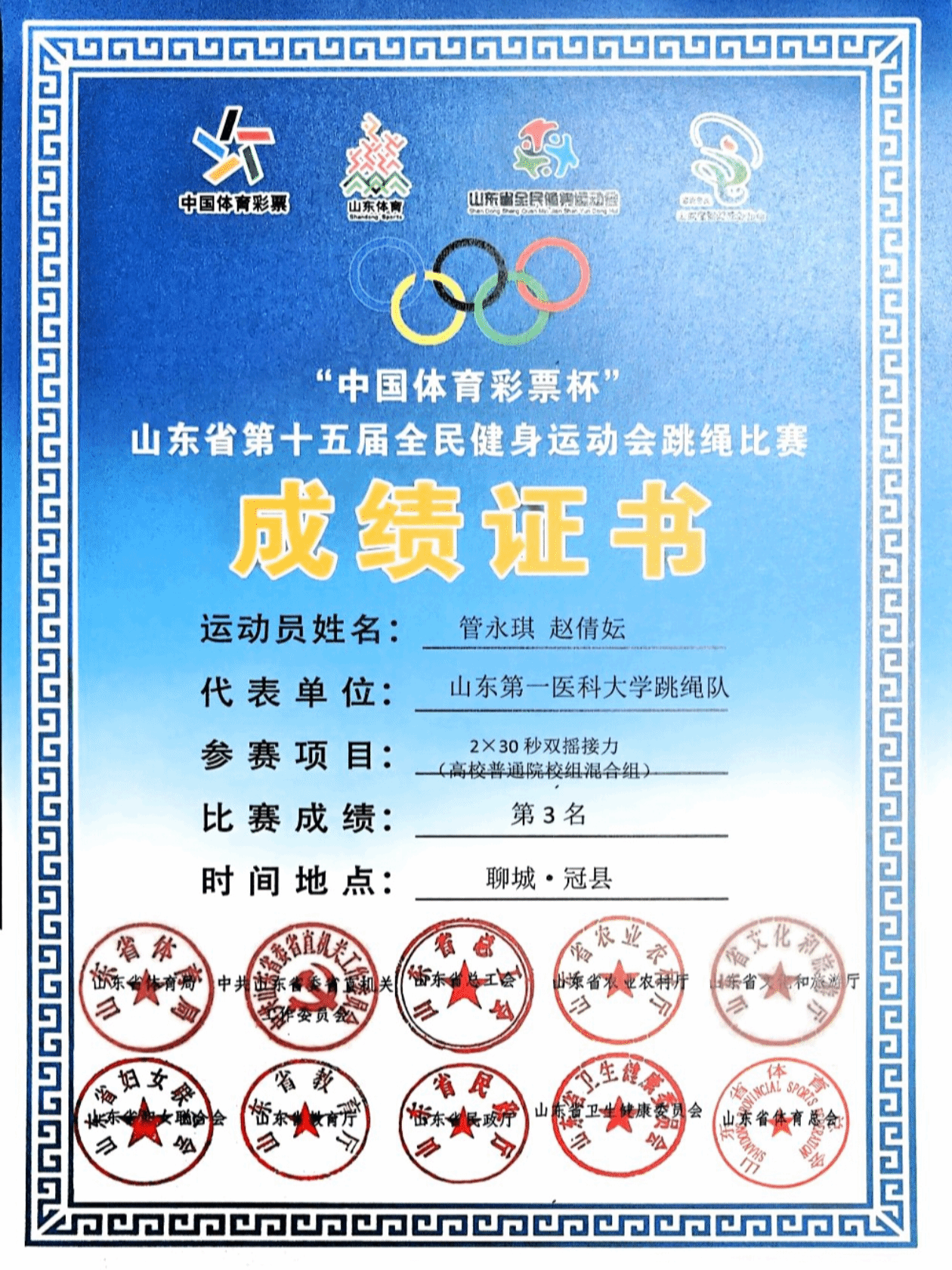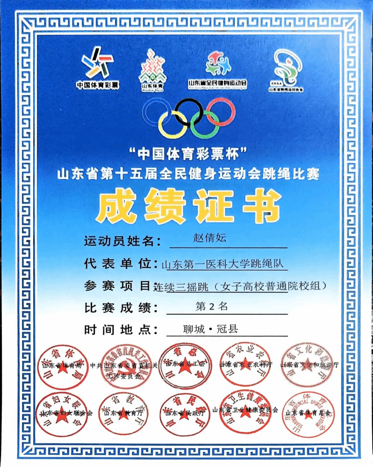 近日,山东省第十五届全民健身运动会跳绳赛圆满落幕,校(院)跳绳俱乐部斩获佳绩。其中beat365在线唯一官网赵倩妘、管永琪同学表现突出,一人揽多枚奖牌,为校(院)争光,尽显护理学子体育风采。