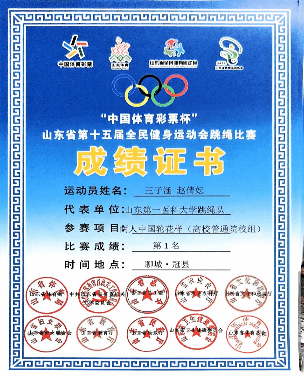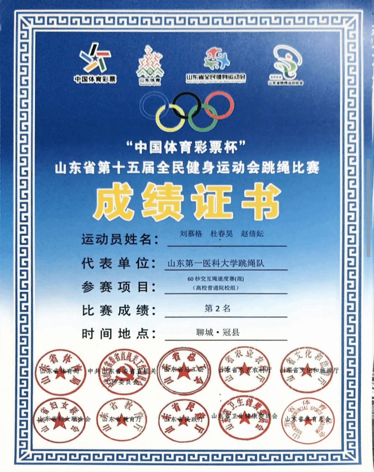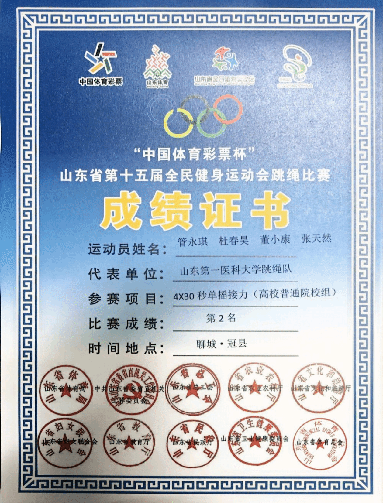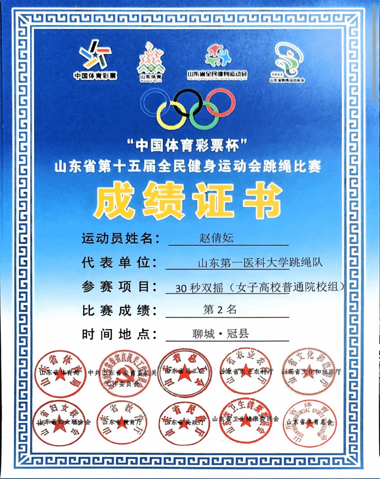 近日,山东省第十五届全民健身运动会跳绳赛圆满落幕,校(院)跳绳俱乐部斩获佳绩。其中beat365在线唯一官网赵倩妘、管永琪同学表现突出,一人揽多枚奖牌,为校(院)争光,尽显护理学子体育风采。