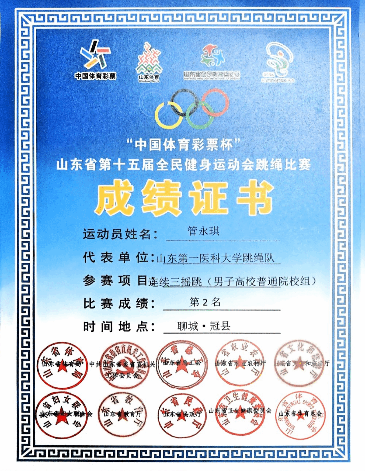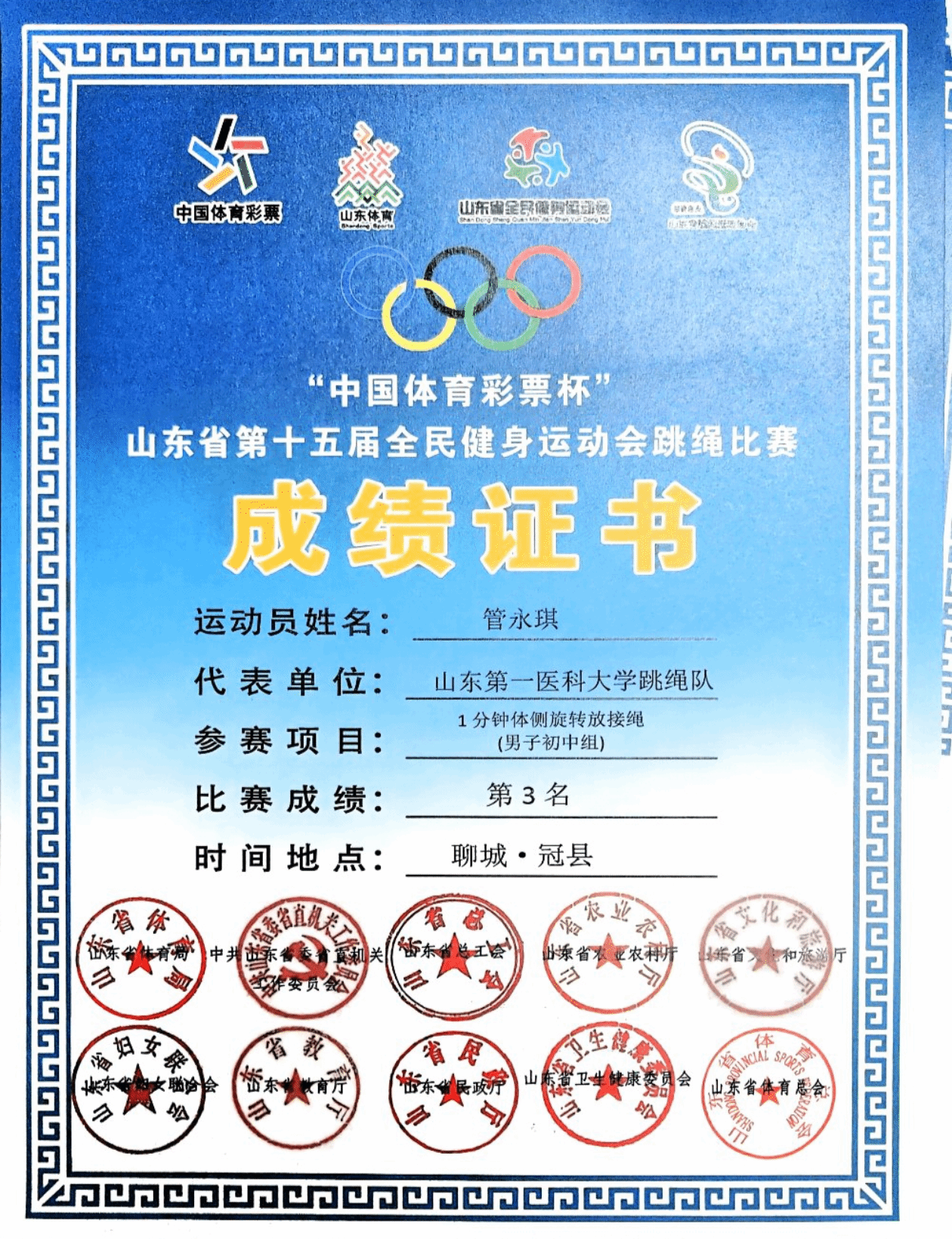 赵倩妘同学获得两人中国轮花样(高校普通院校组)第1名等两项一等奖,三项二等奖及一项三等奖;管永琪同学获得民族个人花样步步高二级(男子高校普通院校组)第1名等一项一等奖,三项二等奖及两项三等奖。一份份荣誉的背后,是他们日复一日地刻苦训练,更是对跳绳运动的热爱与坚守。