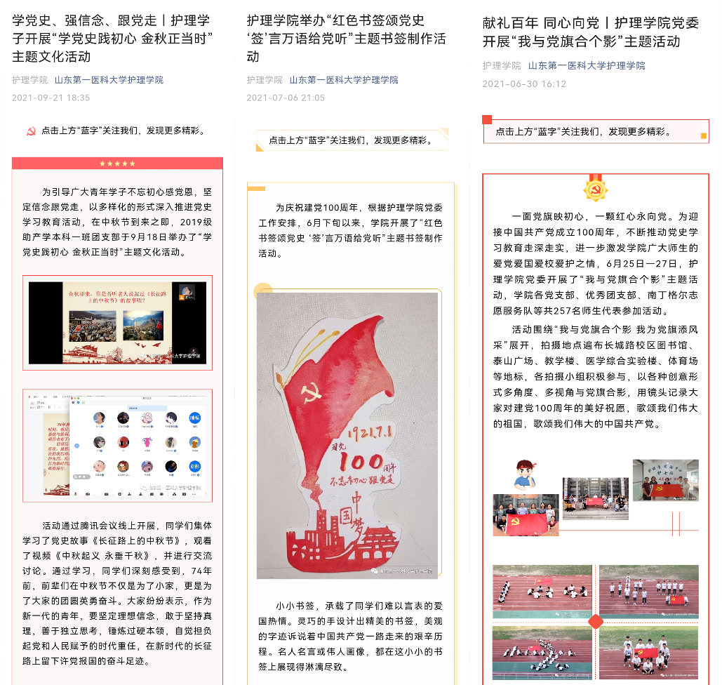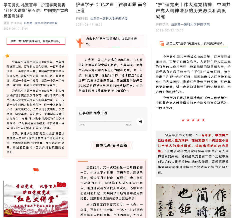 采用“线下”+“线上”的方式,线下开创“红色宣讲团”,创新开启小班宣讲模式,将党的故事宣讲好、传播好、实践好;加强beat365在线唯一官网和南丁格尔志愿服务队两个微信公众号的建设,线上推出红色之声、红色大讲堂、“护”理党史等系列推文,强化舆论阵地。