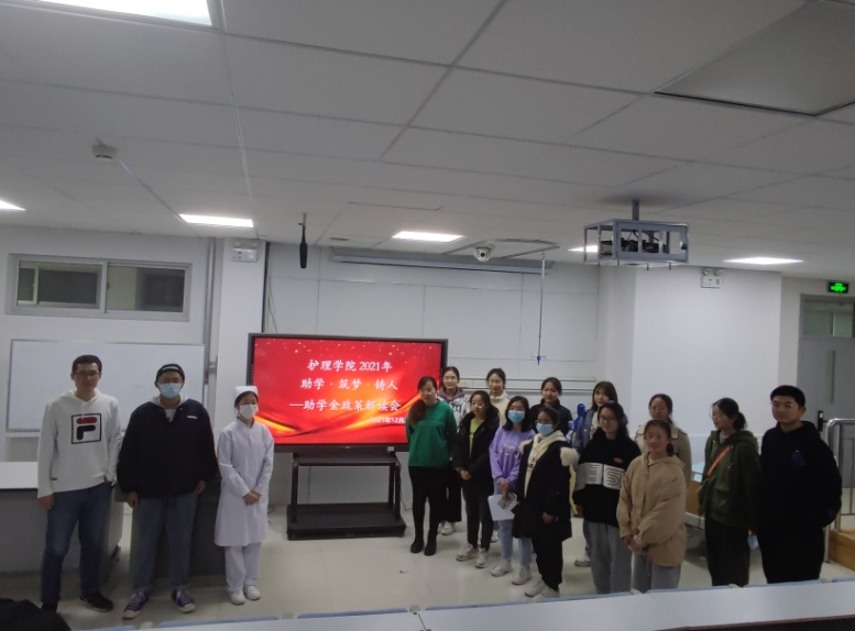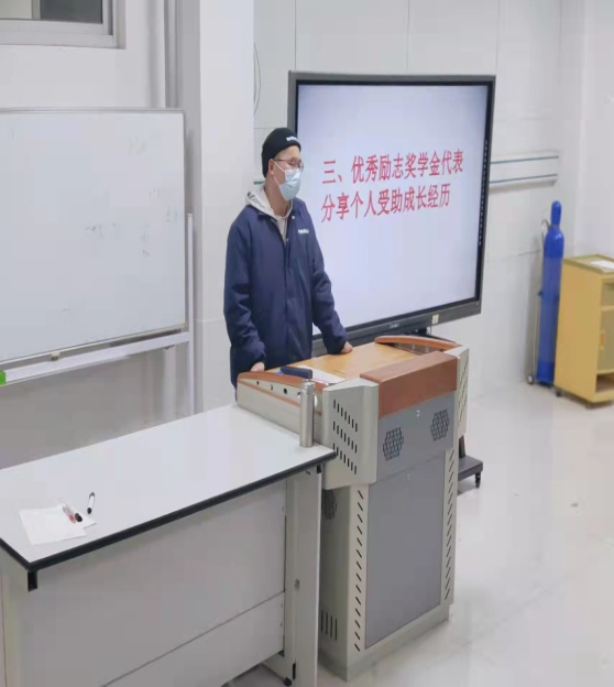 在现场互动研讨会和励志奖学金获得者报告会环节,学院在综合实验楼B204举办了“助学·筑梦·铸人”——奖助政策解读与励志奖学金分享会。 辅导员李新凤、周全,2020级励志奖学金获得者学生代表及2021级50余名助学金获得者参加分享会。