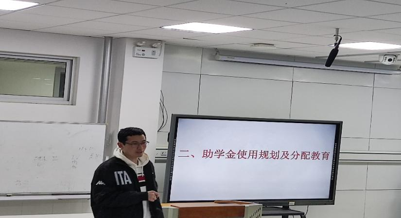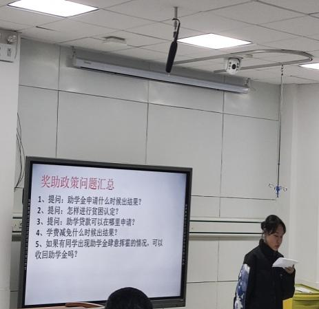 李新凤介绍了奖助学金的相关政策以及申请的基本条件,从勤工助学、助学贷款、国家助学金、建档立卡、学费减免等方面进行了解读,同时强调了在评定中的常见问题。 周全从助学金的使用方面对同学们提出了建议和要求,希望同学们学会统筹安排,合理规划使用助学金。