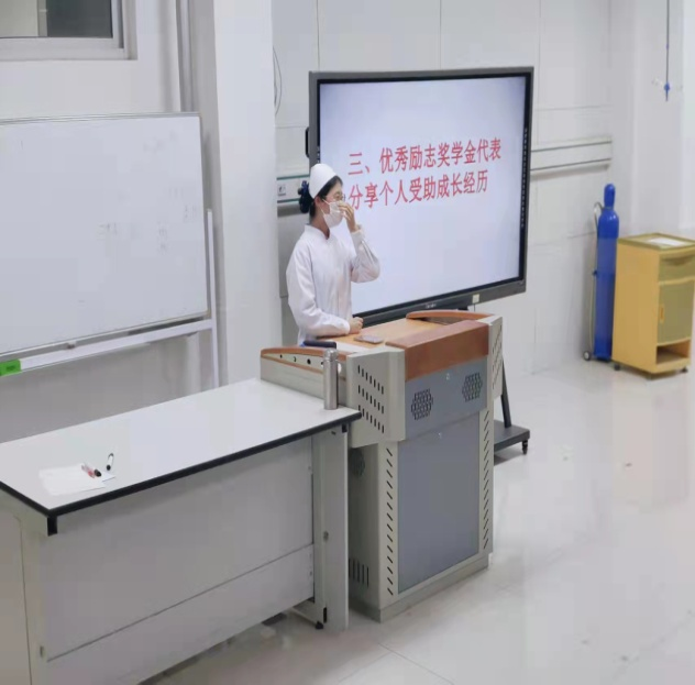 2020级励志奖学金获得者代表周长倩和王亚东同学向新生同学们分享了在过去的一年中自己的成长经历,勉励学弟学妹们要善于坚持、抓住机会,争做有理想、有情怀、有担当的大学生。