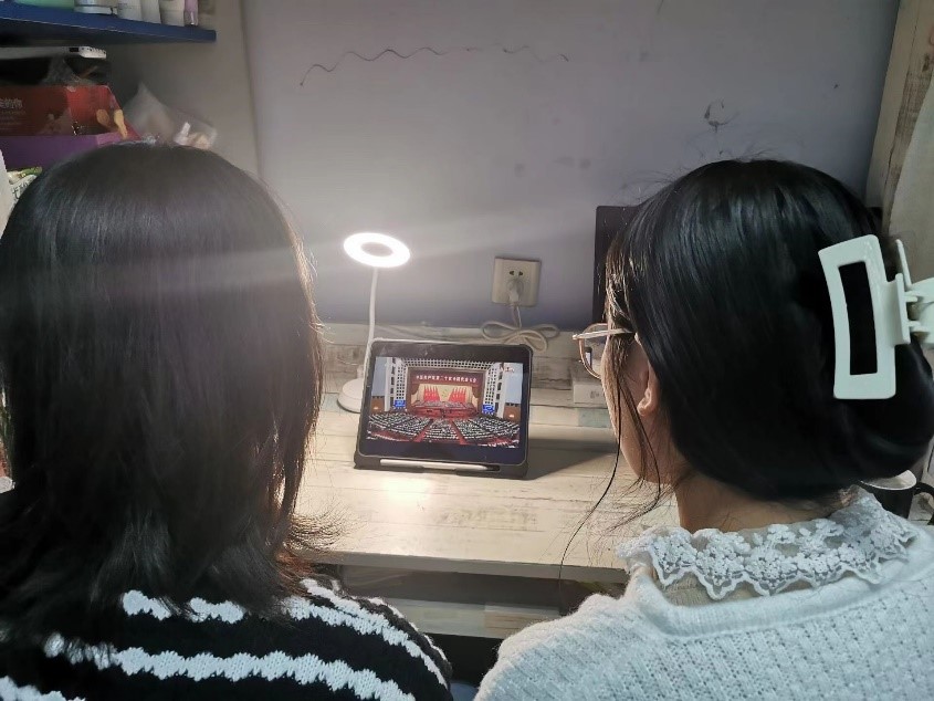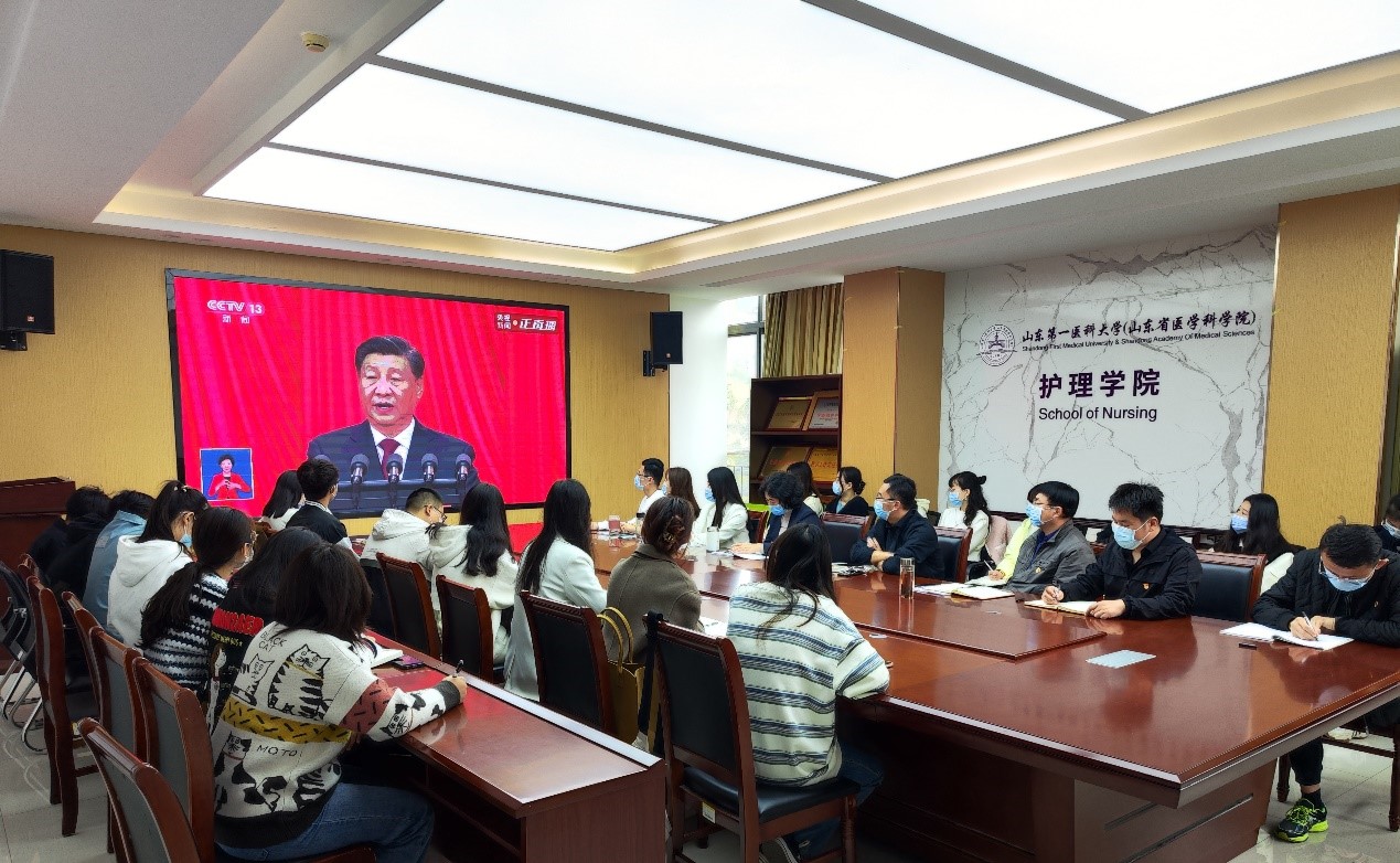 学院在校老师和部分学生骨干在学院会议室集中收看学习;居家办公老师在家收看;部分学生党员代表在长城路校区大学生活动中心集中收看;同学们在宿舍、自习室等地收看。