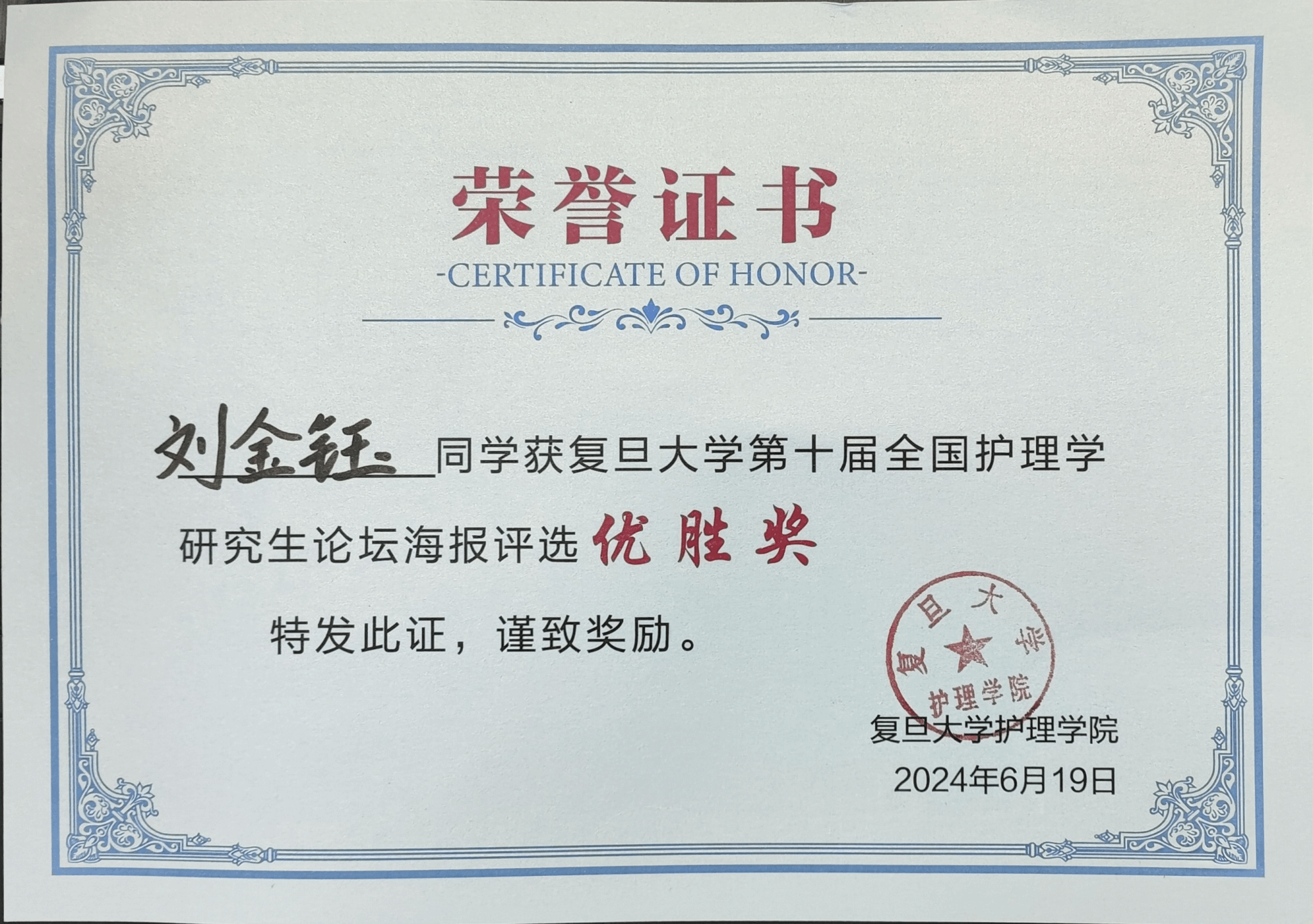 研究生刘金钰同学的论文《计算机化认知训练联合有氧运动对脑卒中后认知功能障碍患者的效果研究》(导师张爱华)做壁报展示,获海报评选优胜奖。