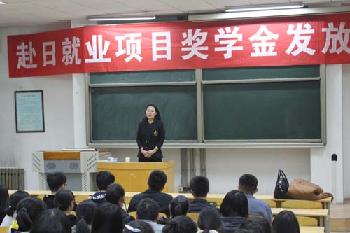 中日双方为获得2015-2016学年度日语奖学金的同学,颁发了奖学金。王英等4名同学获得日语二级奖学金;赵亭梅等9名同学获得日语三级奖学金。邹老师对获奖同学表示祝贺并提出了殷切希望。
