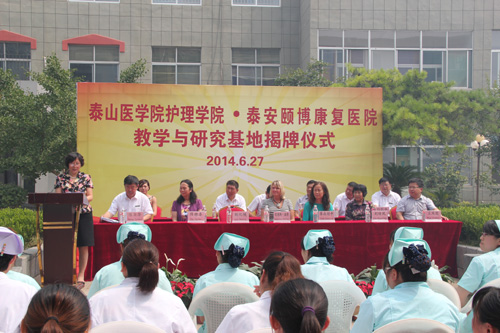 beat365在线唯一官网刘化侠院长在讲话中介绍了我校高等护理教育和护理学科的发展情况和成绩,泰安市颐博康复医院作为beat365首个教学与科研基地的理由和未来发展规划。这次揭牌仪式标志着beat365与泰安市颐博康复医院合作进入了一个新的阶段。特别是,两位美国健康促进专家的参与,为开展三方合作提供了契机。Porter博士和Johnson教授对泰安市颐博康复医院的建设与发展给予高度评价,并对未来三方在教学科研方面的合作寄予厚望。