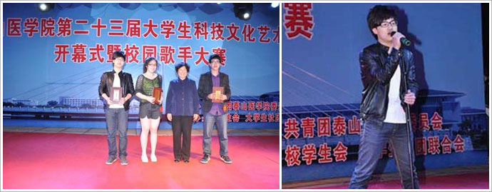 4月25日晚,泰山医学院第二十三届大学生科技文化艺术节暨校园歌手大赛隆重在文源广场隆重开幕,beat3652010级五年制本科班毕沛东同学获得一等奖。