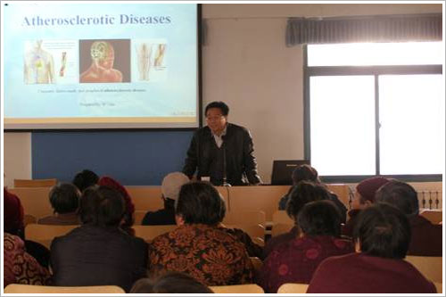 秦博士针对社区老年人这一特殊的群体,用通俗易懂而又不失幽默诙谐的语言,详细讲解了什么是动脉粥样硬化,哪些因素容易引起动脉粥样硬化,以及动脉粥样硬化的治疗与防护。在讲解的过程中,为了与居民进行有效的沟通和互动,秦博士多次拒绝入座讲解,贴近群众,随时回答居民提出的问题,获得了一阵阵热烈的掌声。秦博士说:“科研的最终目的是造福人类。父老乡亲们,你们是最可爱的人,你们为了家人、为了社会奉献了宝贵的青春,现在你们老了,该接受我们的回赠了……”。
