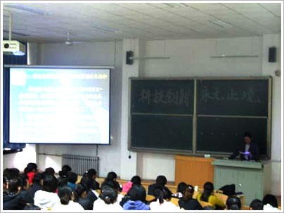 张科长以泰安市大学生科技创新项目为切入点,结合多年从事科研工作和学生科技创新工作的亲身经历,就大学生科技创新的意义、我校历年立项情况、如何选题、如何网上申报、如何开展研究和结题等五个方面作了详尽地分析和总结。张科长深入浅出的讲解,消除了广大同学对科技创新的茫然,让大家觉得只要勇于探索,善于发现,科技创新就在我们身边。