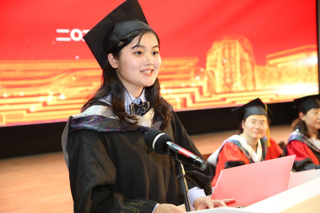 学院苏爱华老师作为教师代表回顾了2022届毕业生在校生活的点点滴滴,对正处于人生重要转折点的毕业生们给予叮嘱和期望。省级优秀毕业生代表李金潞同学进行了发言,深切表达了对老师的感激之情和对同学、朋友的不舍之情以及即将踏入社会的坚定信心。