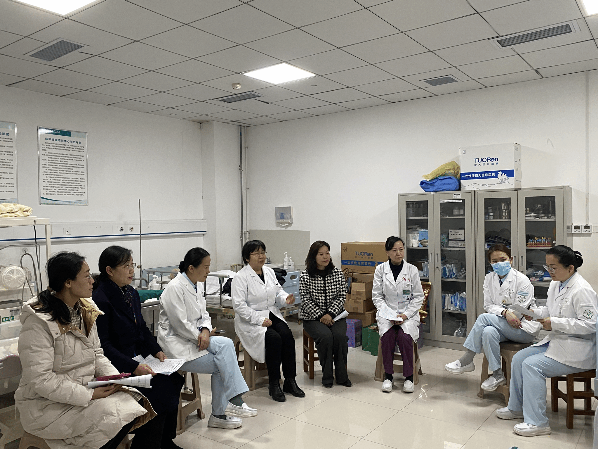 3月7日下午,beat365在线唯一官网副院长陶如与护基教研室主任高英丽、教师郭丽到第一附属医院技能培训中心,看望备战冲刺2024年山东省大学生医学技术技能大赛护理学专业赛道的集训选手,查看参赛选手的训练进程,为选手加油鼓劲。一附院副院长许翠萍、护理部主任季红、护理部副主任宋红霞,技能训练中心主任周军,儿科护士长张莉及护理部干事陪同活动。