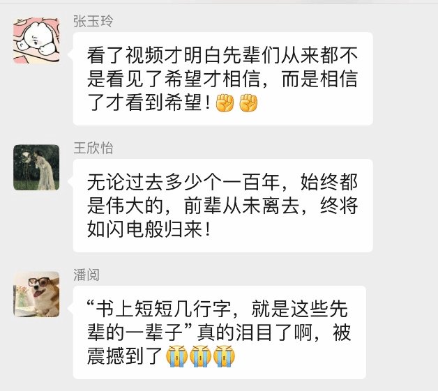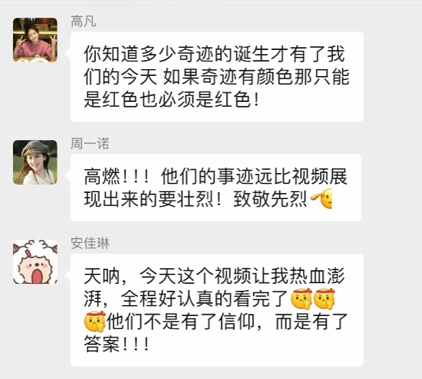 视频中先烈们的英勇事迹引起学生党建服务中心同学们的热议。高凡感慨“你知道多少奇迹的诞生才有了我们的今天?如果奇迹有颜色,那只能是红色也必须是红色!”张玉玲发自内心地说:“看了视频才明白,先辈们从来都不是看见了希望才相信,而是相信了才看到希望!”……