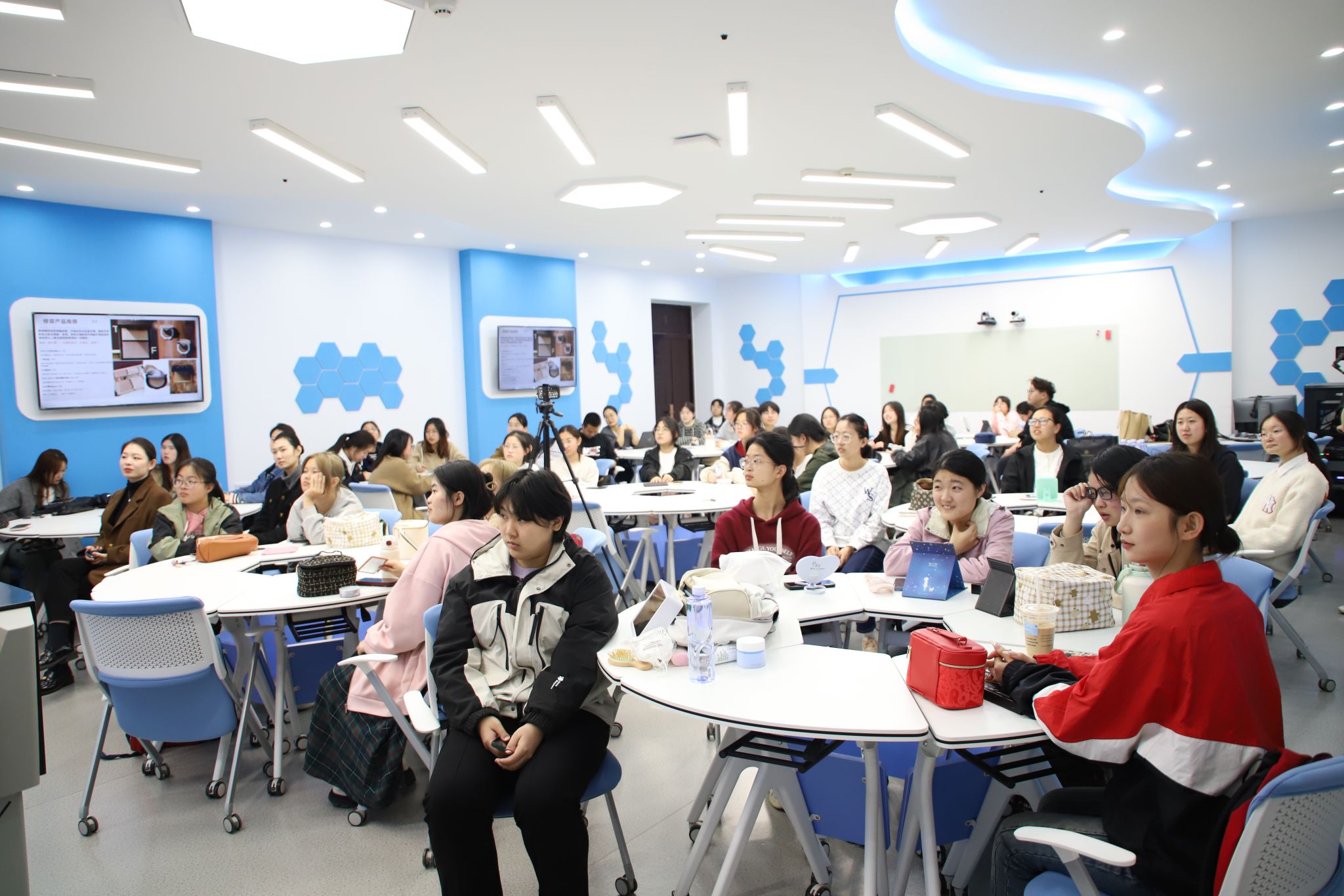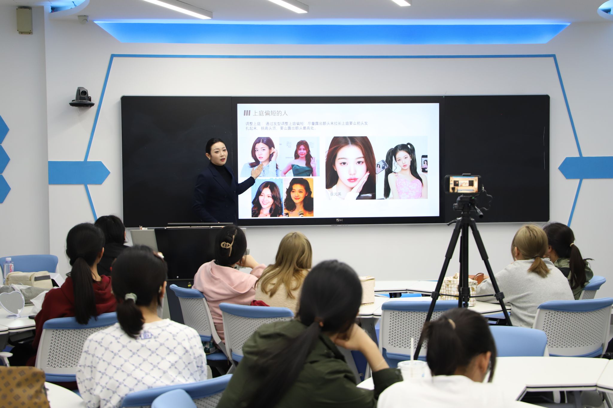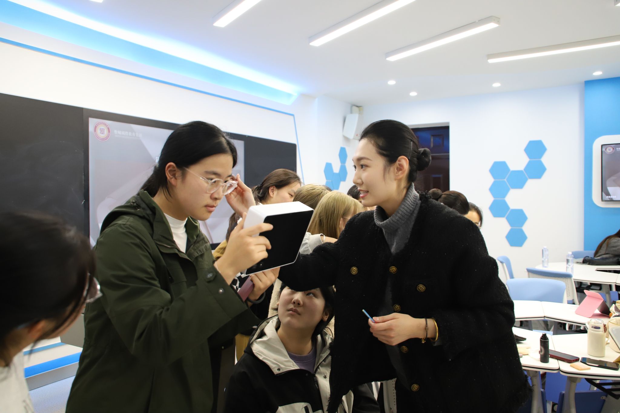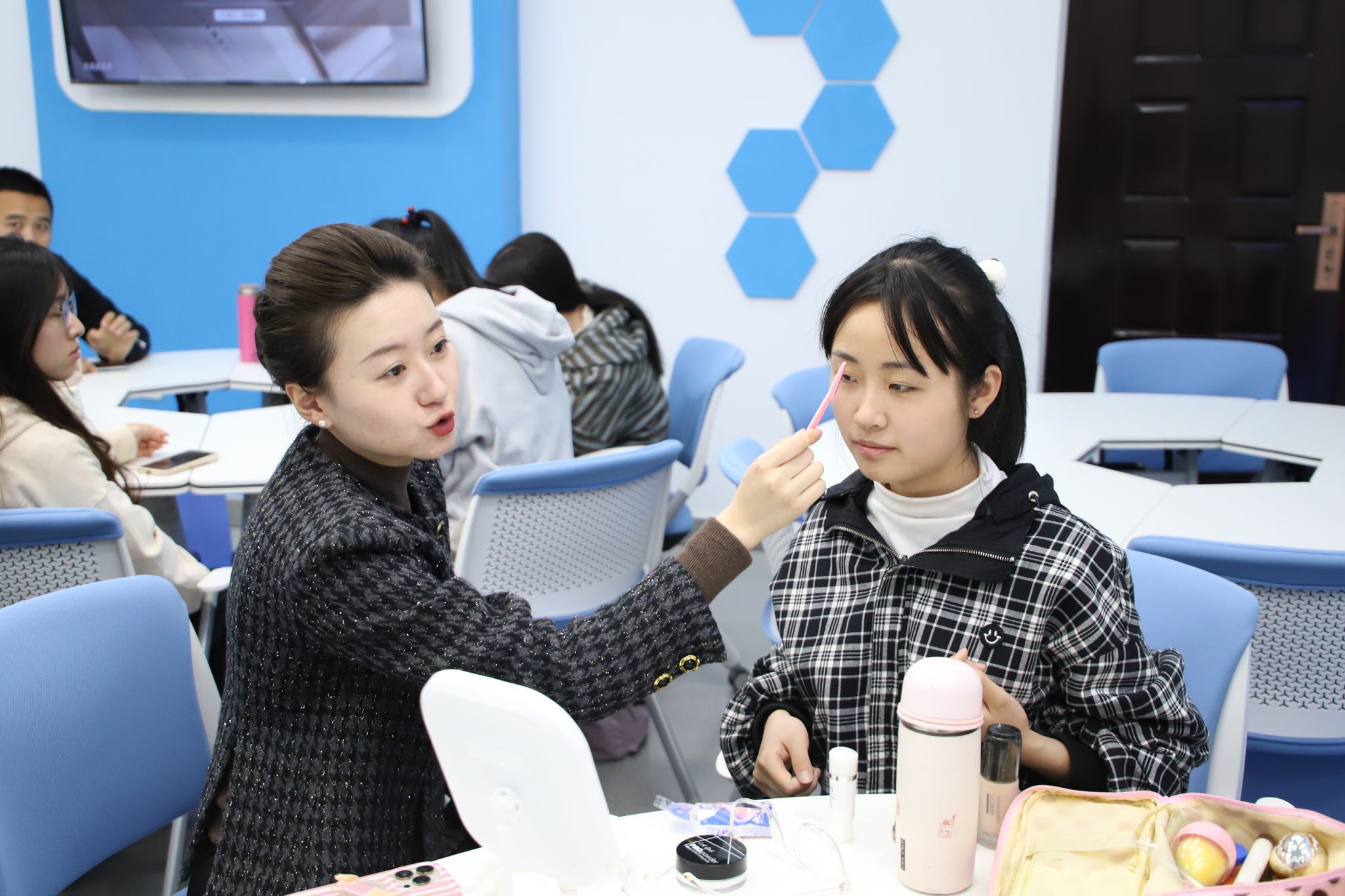 接下来,在实践环节中,四位专业老师走进同学们当中指导大家进行实战操作。她们根据每位同学的形象、气质给出适合自身妆容的中肯建议,并为同学们详细讲解了每一个步骤的技巧与注意事项。整场培训会气氛热烈,同学们学习热情高涨,收获满满。
