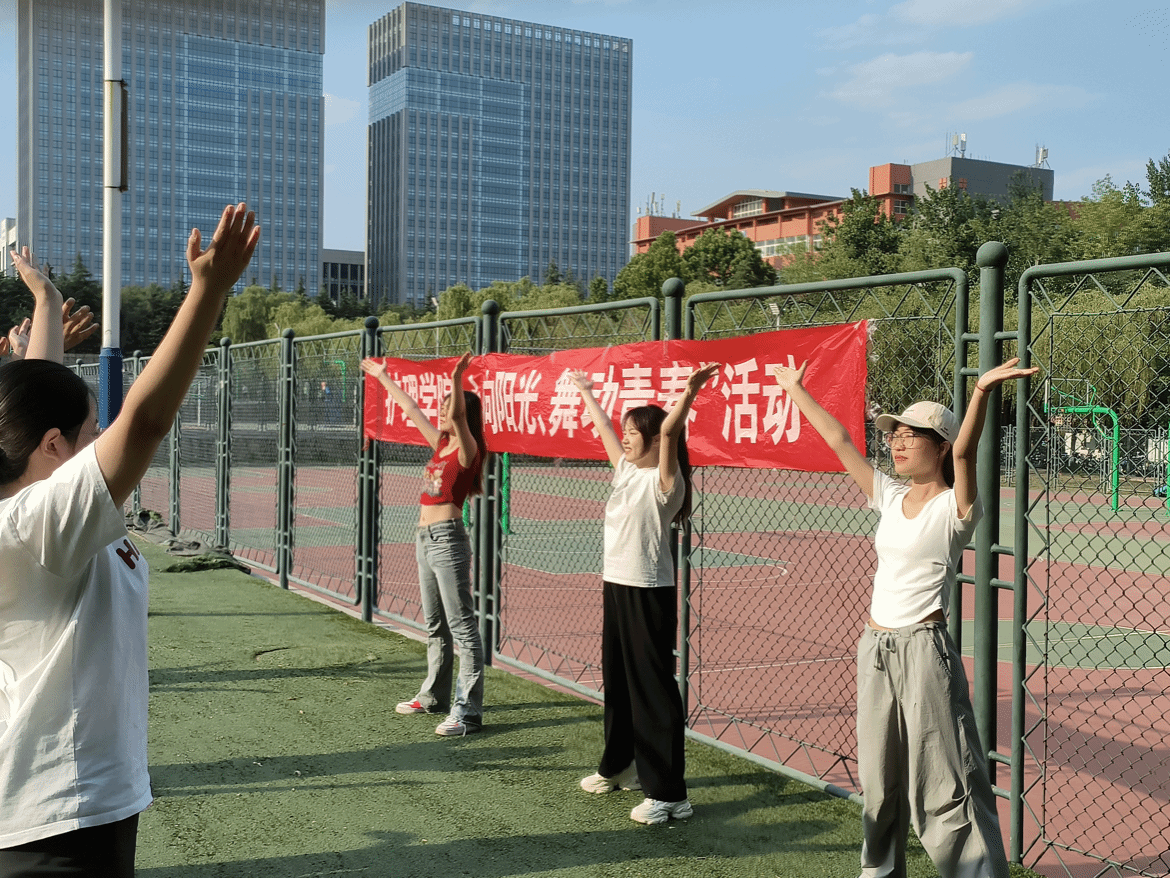 随着欢快的音乐响起,三名领舞人面带灿烂的笑容,带领同学们一起跳舞,通过她们的耐心指导,同学们快速掌握了动作要领,打磨了舞蹈细节。伴随着轻快的歌曲,同学们一同舞蹈时,脸上展现的是自信与昂扬的神态,脚下起舞的是美丽与欢快的舞步。他们的表演不仅吸引了现场观众的自觉加入,也向大家传递了积极向上、自信阳光的生活态度。