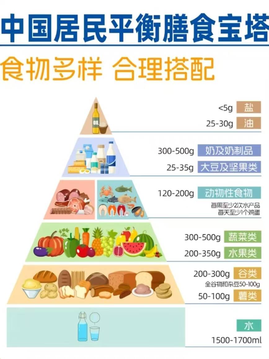 食物多样,合理搭配。膳食宝塔以图形化形式精确展示了各类食物在膳食中的适宜比例与数量,帮助公众平衡饮食,改善公众膳食营养状况。膳食宝塔中,水作为生命之源,位于宝塔最底部,凸显其基础且不可或缺的地位;第一层为谷薯类,强调其在膳食结构中的基础性作用;第二层为蔬菜水果,是维生素与矿物质的重要来源;第三层为鱼禽肉蛋等动物性食物,富含优质蛋白质、脂类及多种维生素与矿物质;第四层为乳类,对骨骼健康与免疫力提升至关重要;而位于顶层的烹调油与盐,则提醒公众需控制摄入量,避免食用过量带来的健康风险。