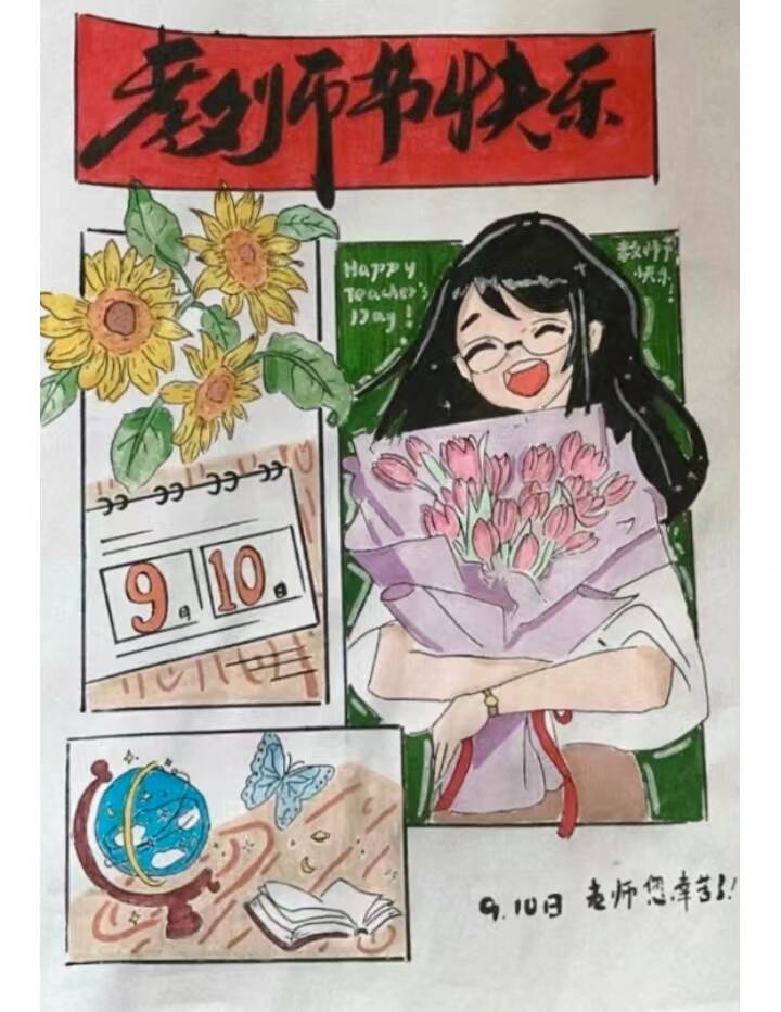 活动期间,同学们围绕教师节祝福的主题积极展开绘画创作。他们充分发挥自己的想象力和创造力,运用各种绘画形式创作出一幅幅饱含深情的作品。这些作品内容积极向上,色彩搭配协调,具有较强的艺术表现力和感染力,对老师的敬意与感恩之情跃然纸上。通过对各个作品的综合评选,以下作品在活动中脱颖而出: