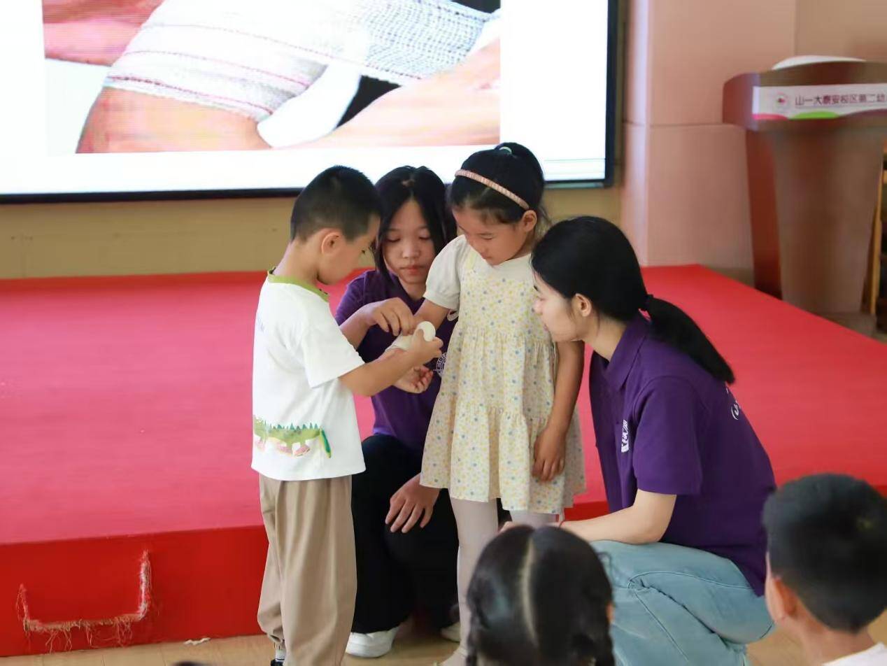 活动现场,宣讲人以小短片、故事会等形式,向小朋友们讲述了红色军医的感人事迹。此外,队员们还为小朋友们讲解并演示包扎方法,并组织模拟“小红军”义诊活动,鼓励小朋友们现场动手操作,确保他们熟练掌握技能。