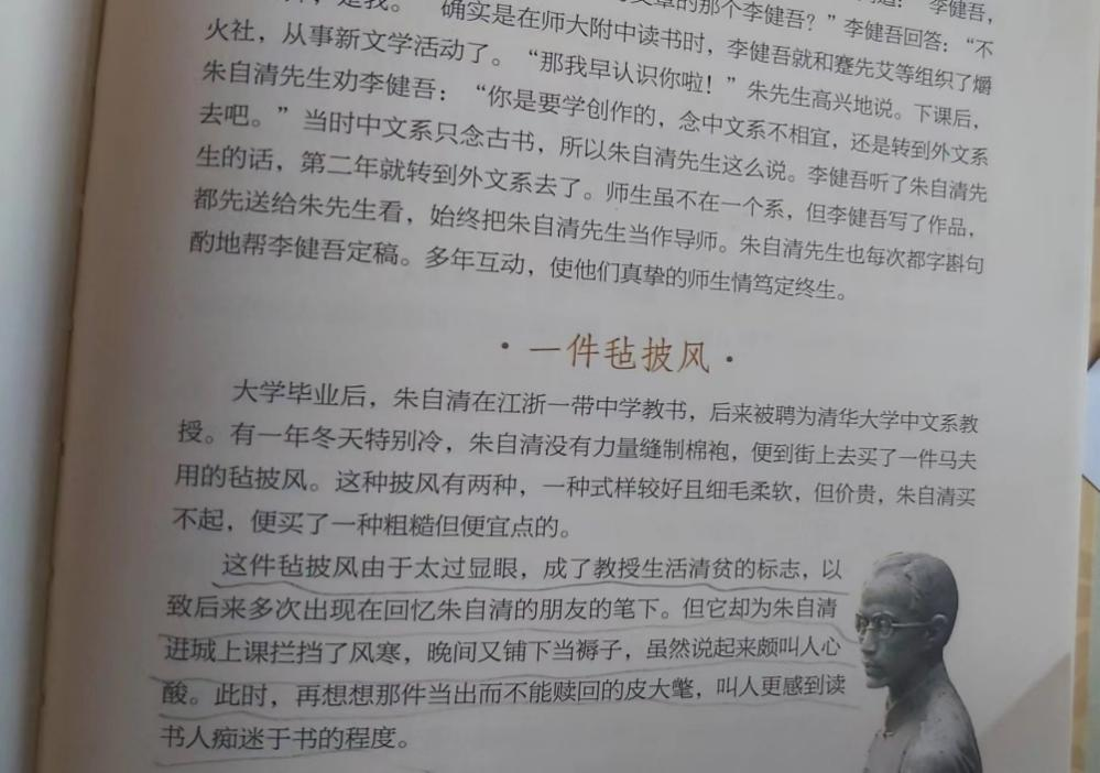 “这件毡披风由于太过显眼,成了教授生活清贫的标志……此时,再想想那件当出而不能赎回的皮大氅,叫人更感到读书人痴迷于书的程度。”出自《朱自清散文经典》,朱自清著。
