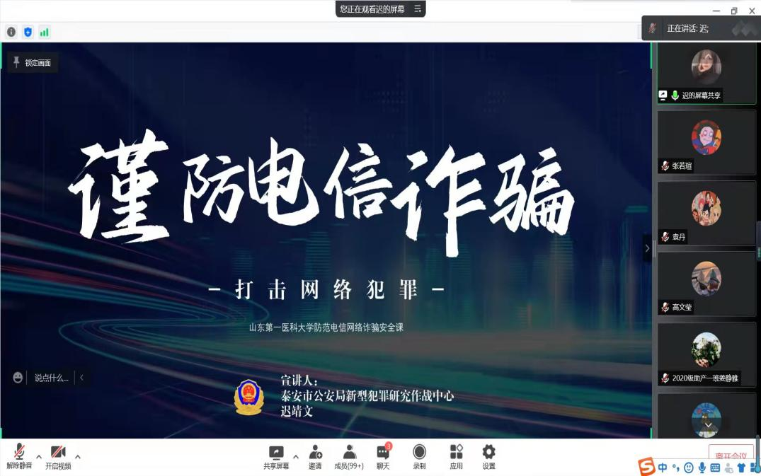 为提高同学们的电信网络安全防范意识,学习掌握反诈手段,增强自我保护能力,近日,beat365在线唯一官网举办“谨防电信诈骗”线上教育讲座。此次活动特邀泰安市公安局新型犯罪研究作战中心迟靖文警官主讲,学院辅导员高星星、周全和2020级、2021级学生线上参加学习。