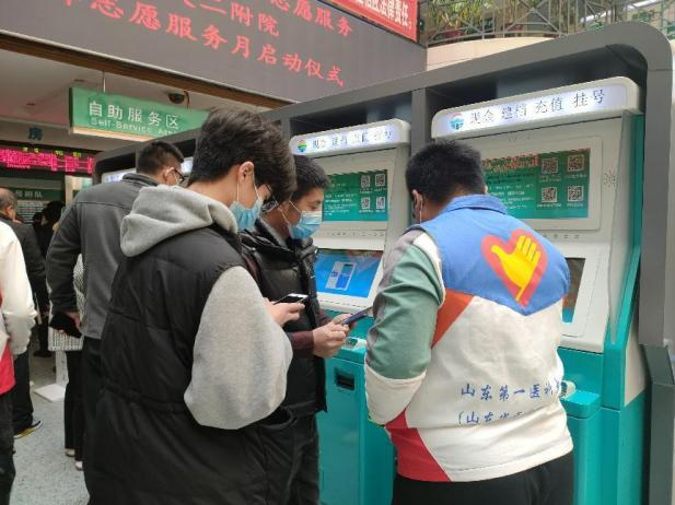 仪式结束后,队员们以热情饱满的态度,细致耐心地协助患者办理挂号、取号、缴费、查询账单、打印检查报告等;在队员们的帮助下,部分中老年患者学会了如何正确使用智能门诊病历打印机;志愿者还帮助患者导医导诊。志愿者用自己的行动让就诊者在医院体验到及时方便贴心的服务,身着统一南丁格尔志愿服装的队员们成为门诊大厅一道亮丽的风景线。