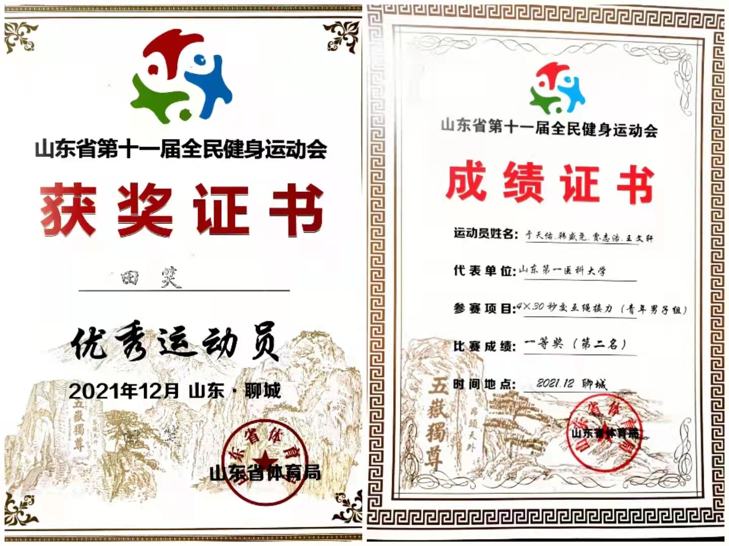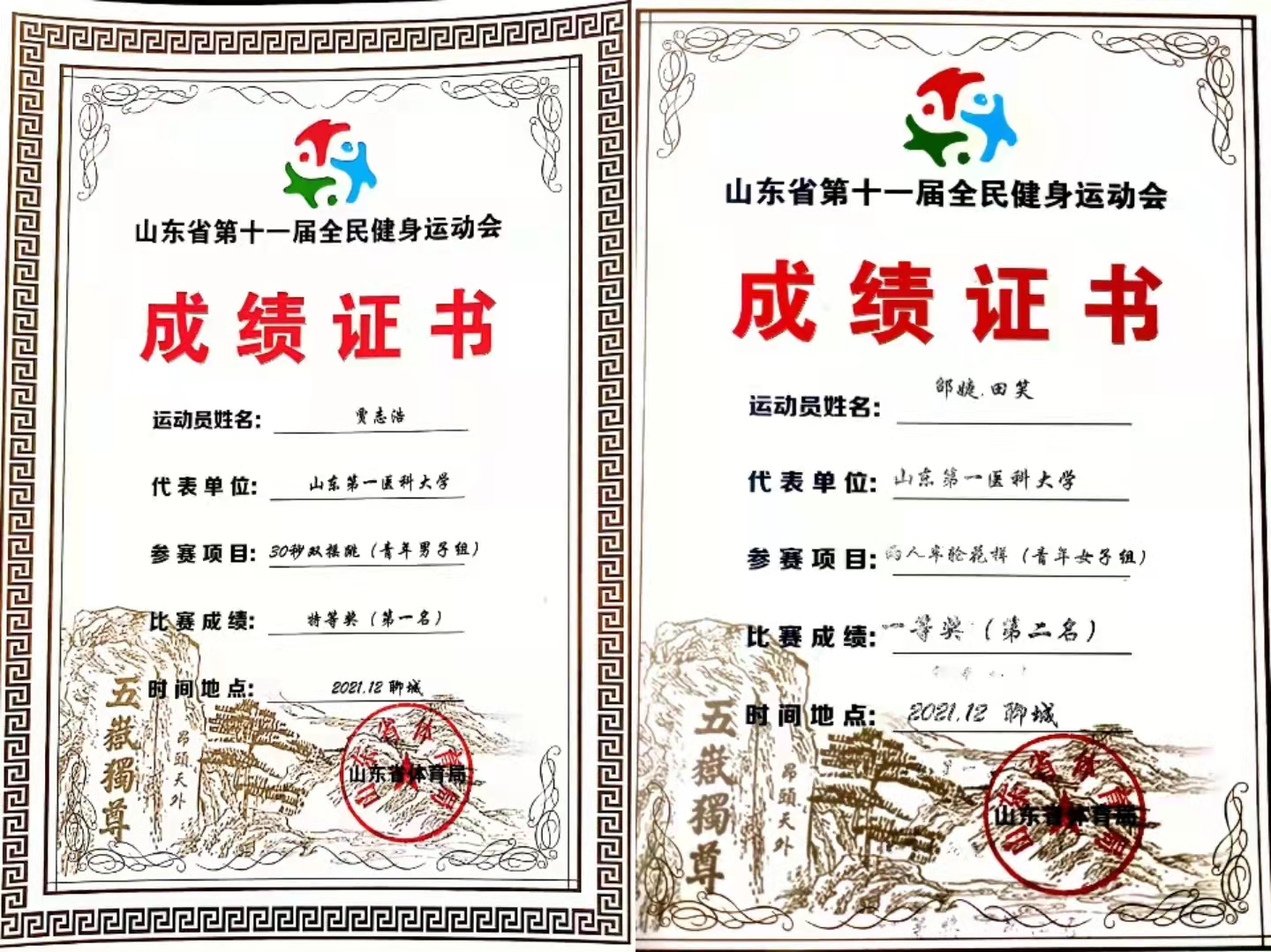 为提高全民身体健康素质,展现全民运动的精神风貌,12月4日至5日,由山东省体育局主办,山东省跳绳运动协会协办的“2021年山东省第十一届全民健康运动会跳绳比赛”在聊城落下帷幕。护理学子贾志浩、田笑积极参赛,为校(院)取得了单人项目两金和团体项目三银的佳绩,田笑同学荣获山东省体育局颁发的“优秀运动员”荣誉称号。