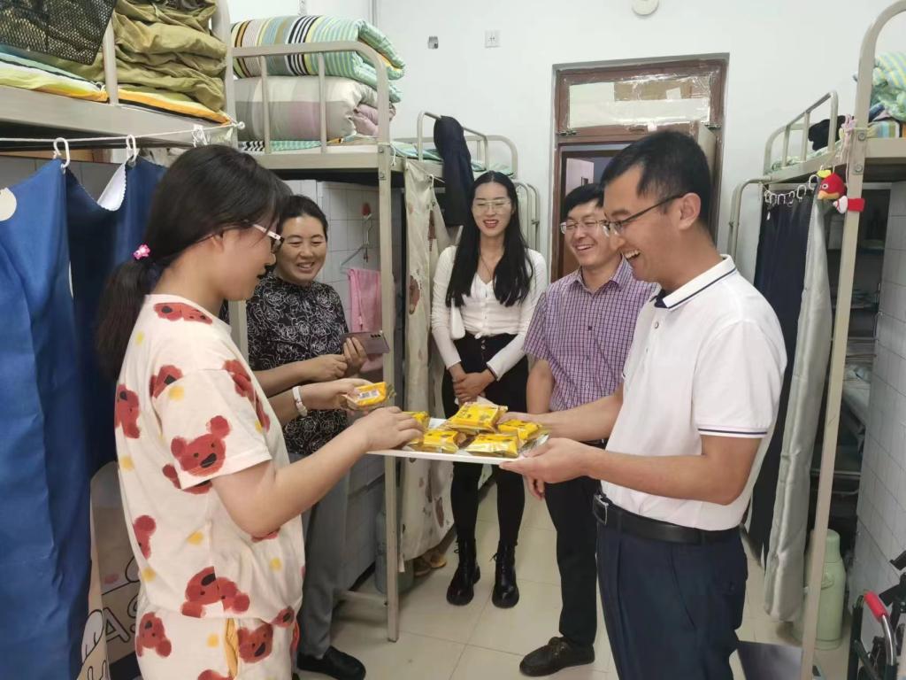 月满中秋,情满护院,中秋节与教师节双节来临。为了让beat365在线唯一官网全体师生尤其是2022级新生在祥和愉悦的氛围中欢度中秋,感受家般的温馨与关爱,9月9日下午,beat365在线唯一官网党委书记张延玲、副书记林桦、全体辅导员,进宿舍、进教室、进军训场为护理学子们发放中秋月饼,将学院的深切关爱和温馨祝福送给同学们。