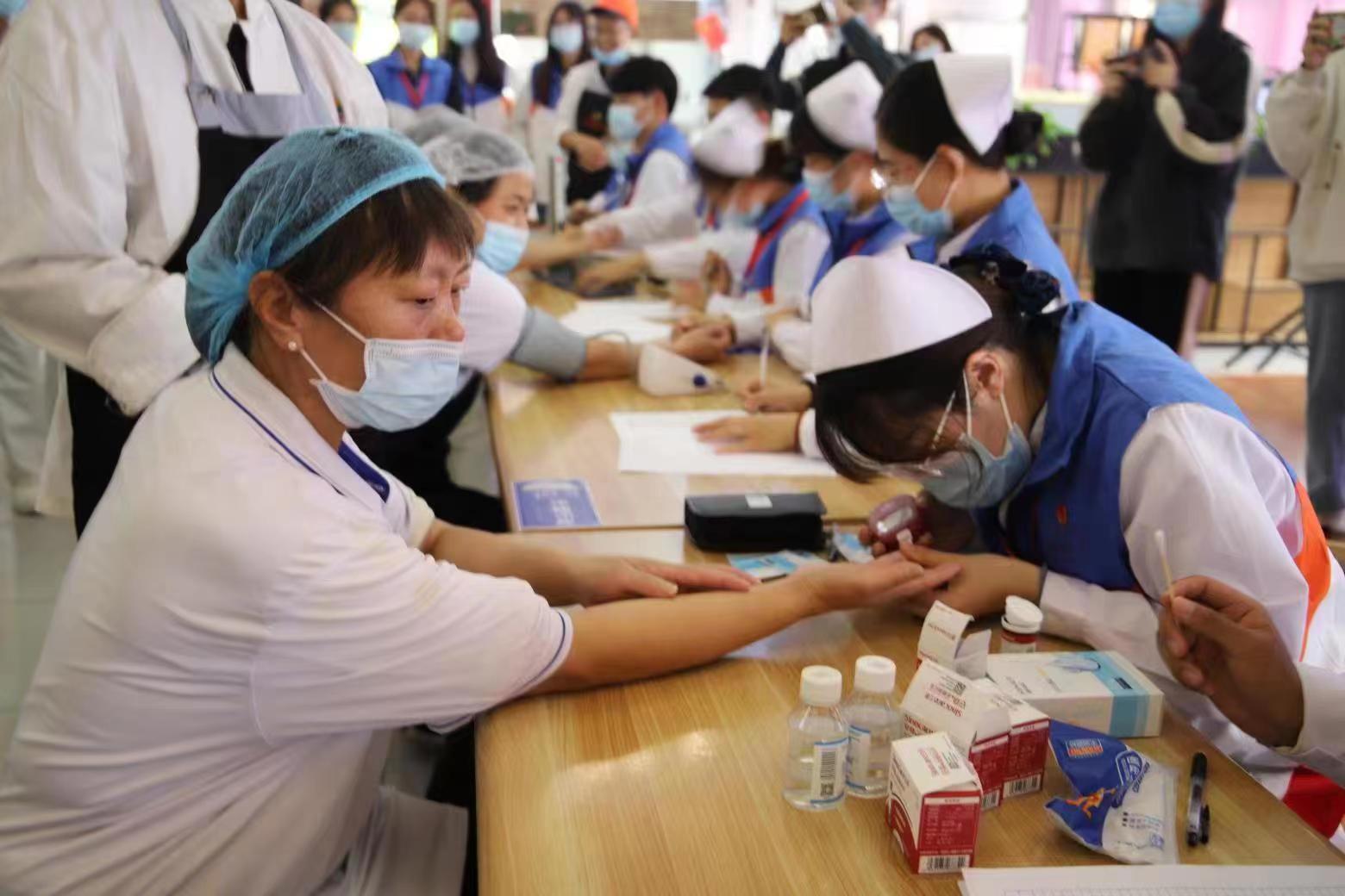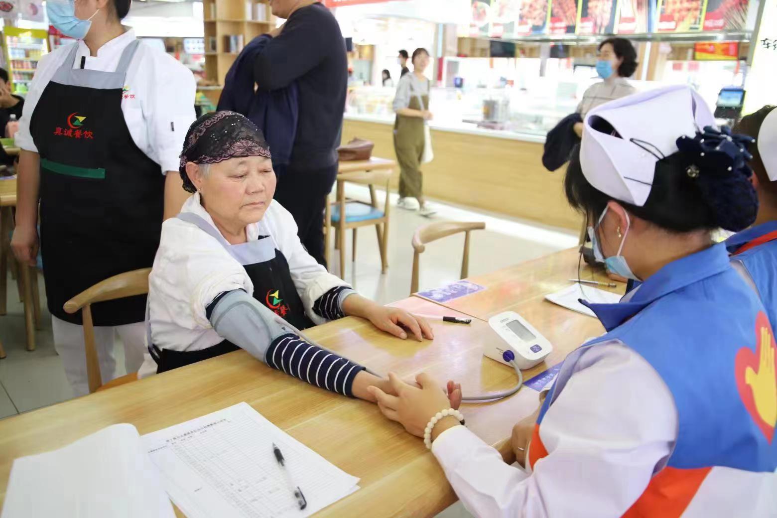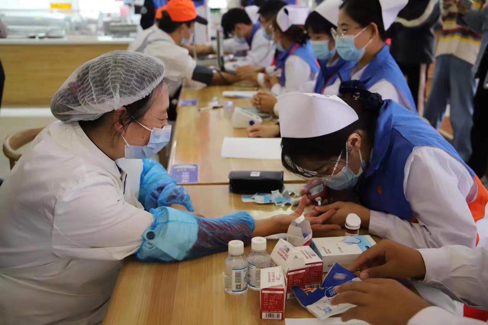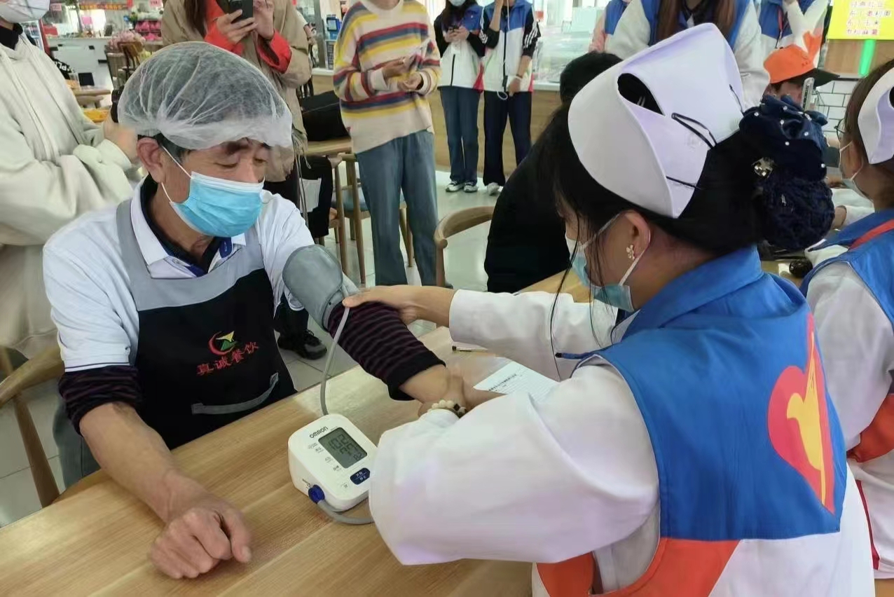 活动期间,队员们有秩序地组织餐厅员工量血压、测血糖,志愿者操作娴熟,一丝不苟,以过硬的专业知识保证了测量的准确性。同时志愿者向后勤人员讲解健康保健知识、日常注意事项、营养饮食等卫生常识,也耐心地解答大家提出的问题。对于测量结果不在正常区间范围的,队员们也从饮食、睡眠、运动锻炼等方面给出了意见建议。