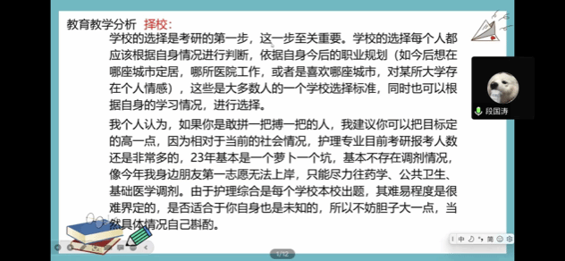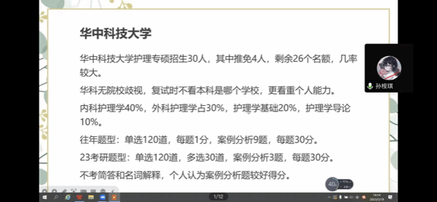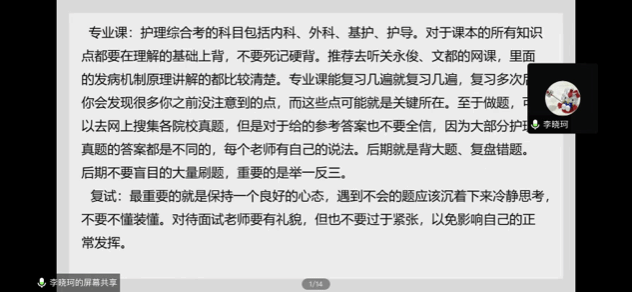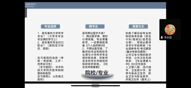 分享会上,考取山东大学的周佩云和徐锦,考取华中科技大学的孙桉琪,考取黑龙江中医药大学的段国涛,考取宁夏医科大学的李永航,考取北京大学的李晓珂分别从考研学校的选择、实习医院的挑选、考试科目的学习、复试注意事项、考研时间分配等方面为同学们分享了自己的考研经验。