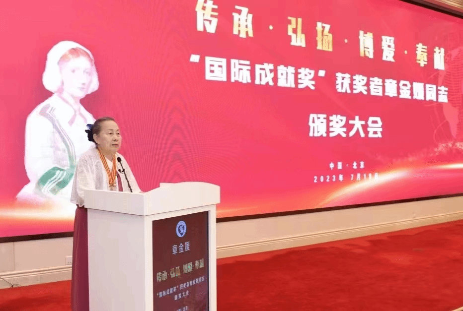 章金媛名誉理事长发表获奖感言。她表示“国际成就奖”是国际护士会对中国护理事业及护理志愿者的肯定,必将进一步激励更多护理人员弘扬当代南丁格尔精神争做守护全国百姓健康的主力军、头排军,为推进人类命运共同体建设谱写新篇章。