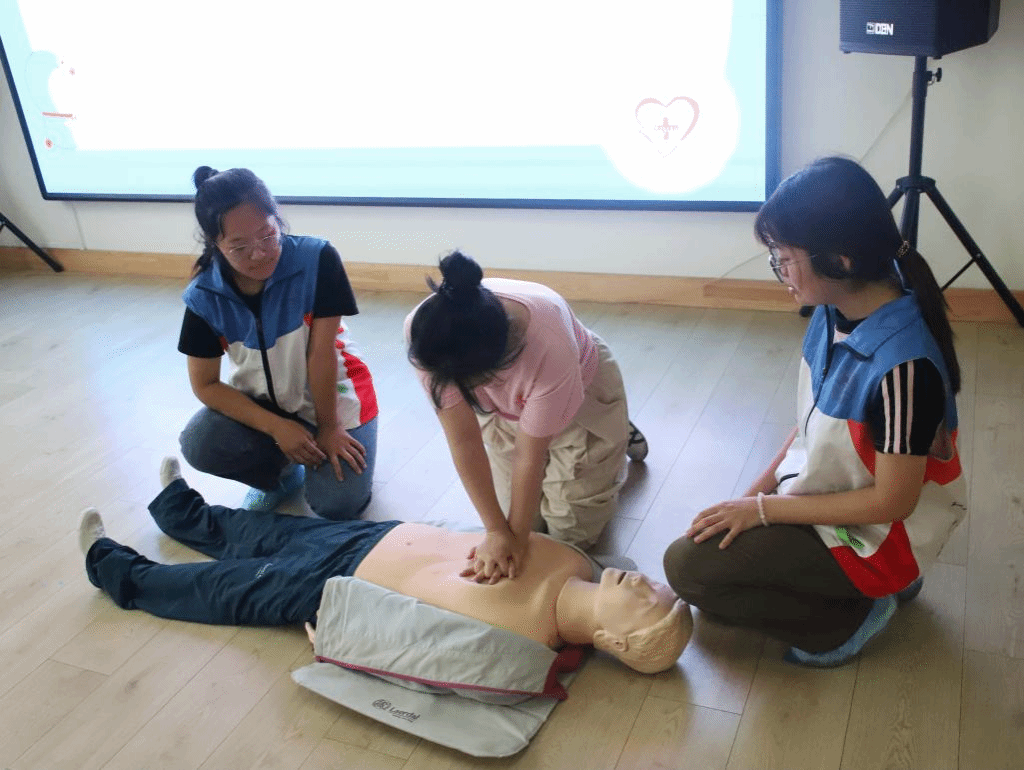 宣讲结束后,队员们还为大家进行了心肺复苏操作步骤的讲解,借助人体模型展示心肺复苏的动作演练,鼓励儿童上台练习,队员在旁指导,耐心地对他们不够规范的动作给予建议,帮助大家掌握正确的急救方法。
