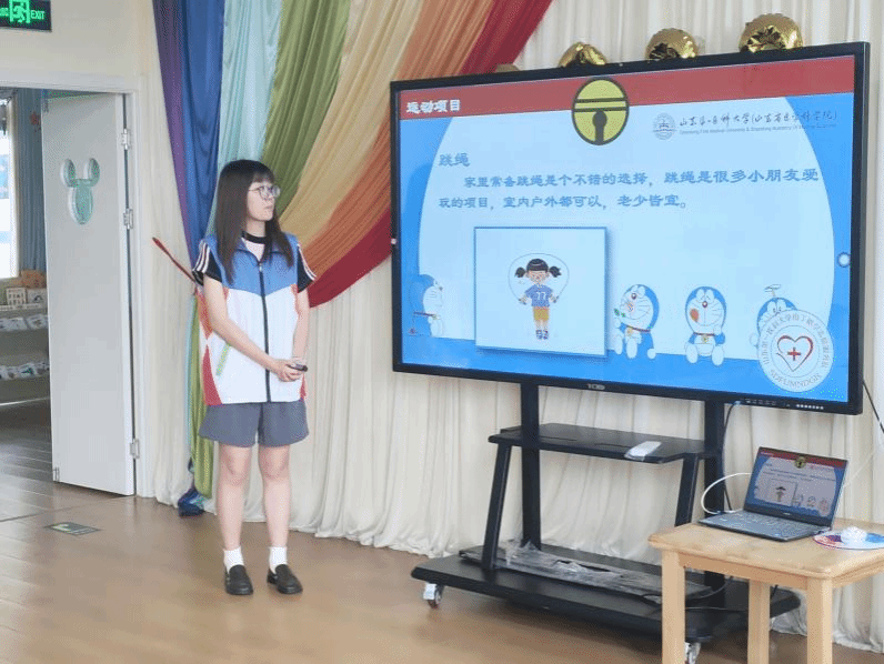 第二天活动主题为运动健康教育。队员组织带领小朋友们进行团队协作游戏“仙桃接力”,利用PPT向小朋友宣讲运动前的准备工作以及运动中摔倒、拉伤等突发情况的应对措施,介绍运动有防止肥胖、改善睡眠、愉悦心情、降低心血管疾病发生的风险等好处,鼓励小朋友日常多运动,强身健体。