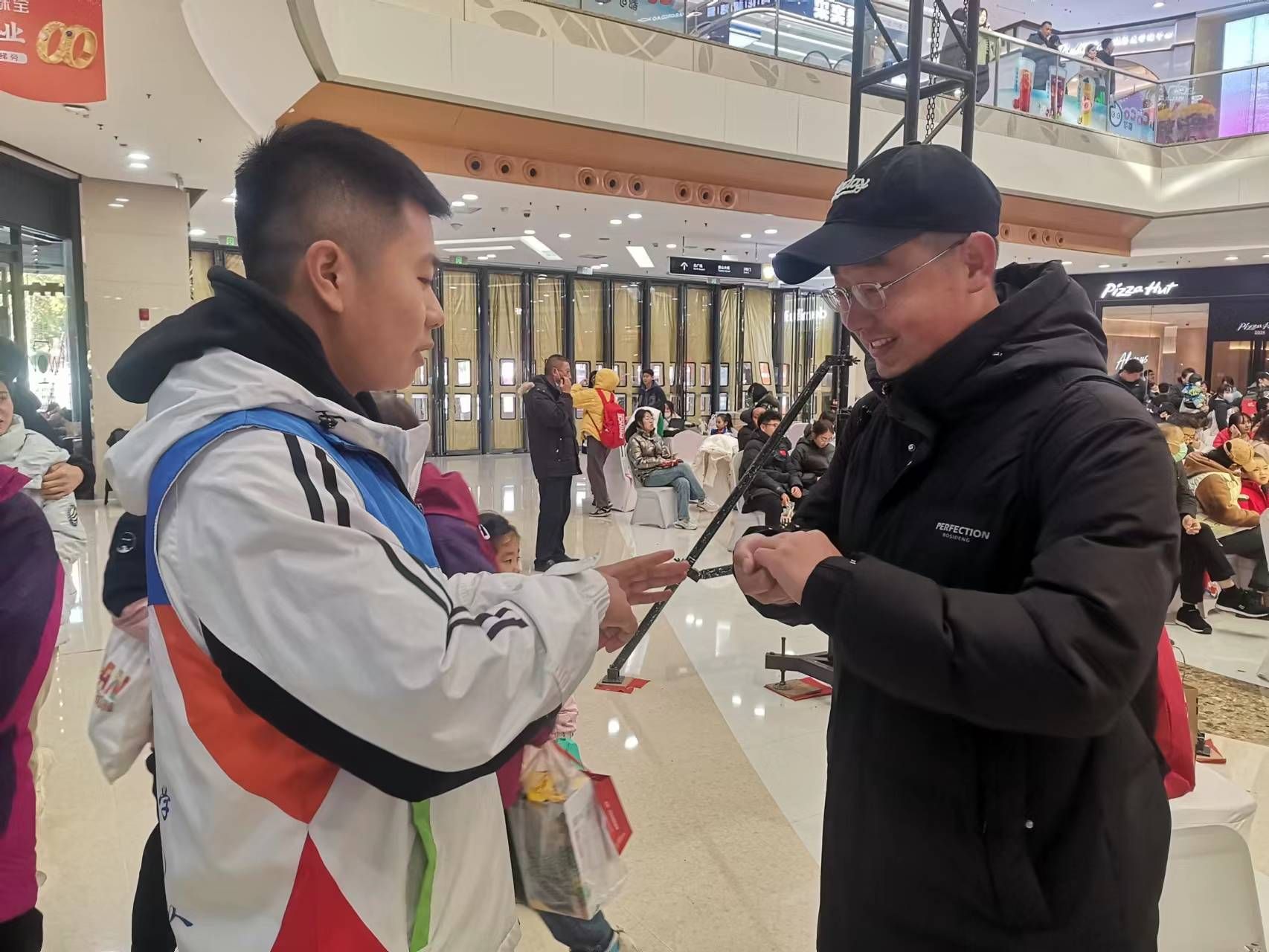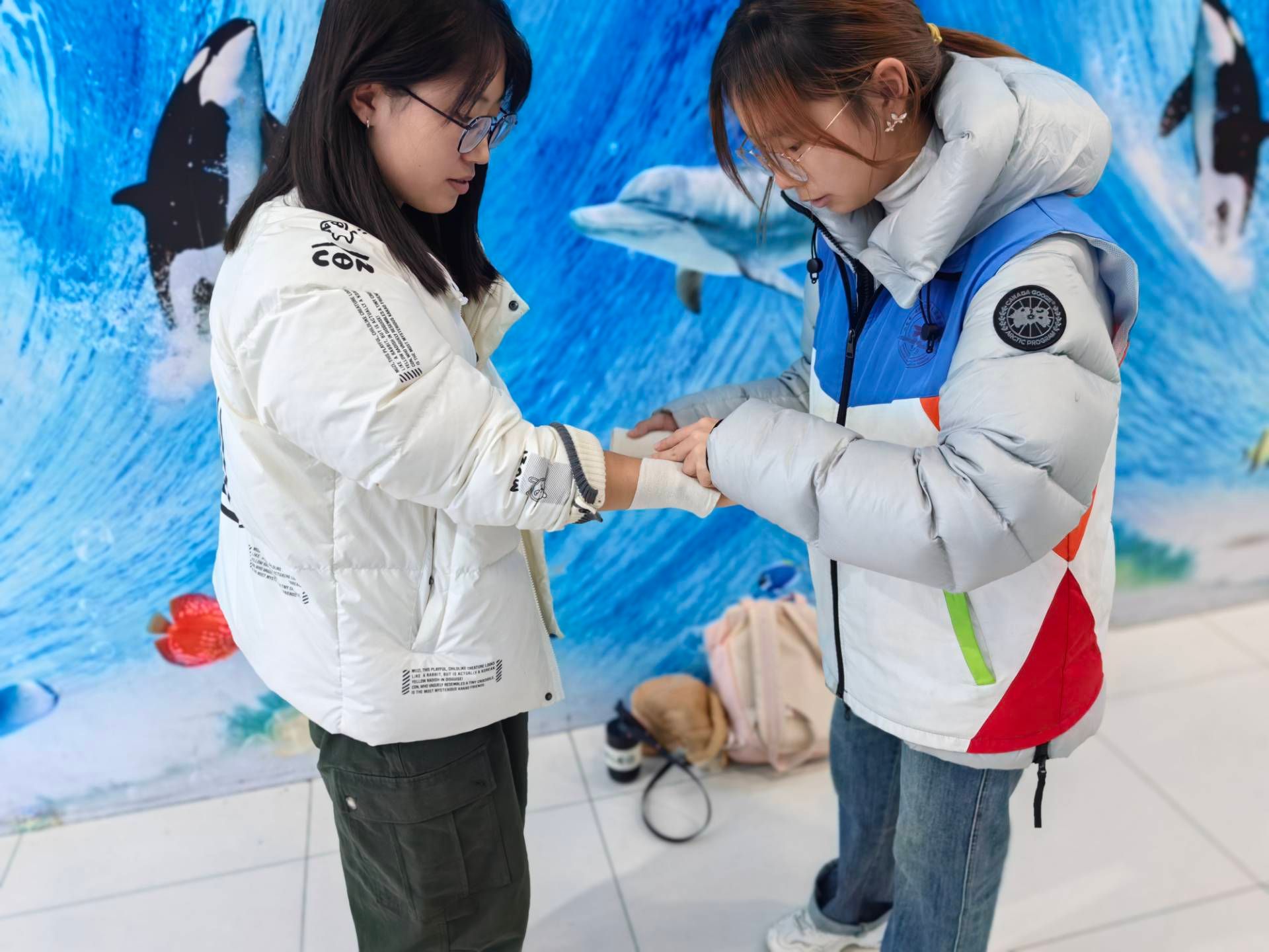 在爱琴海购物公园,队员们向商场群众现场讲解如何进行心肺复苏、如何使用绷带进行急救包扎等急救知识,并利用绷带演示了对手部、腿部进行快速止血与包扎的操作,鼓励大家动手实践,增强了群众体验感。