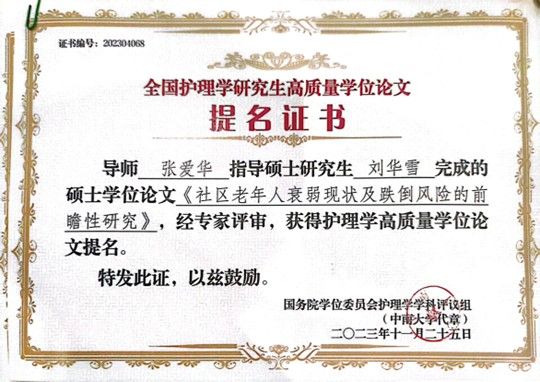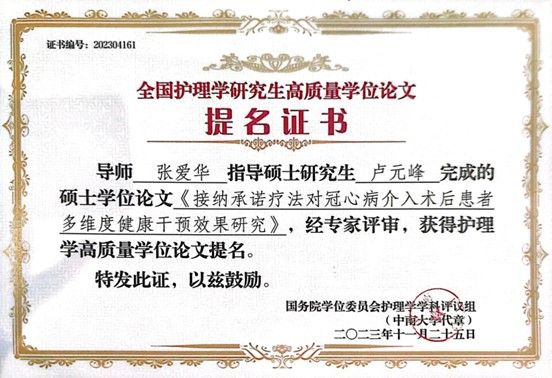 为拓宽学院教师及研究生学术视野,加强学科建设、提升护理研究生的培养质量,在张爱华院长带领下,本次大会beat365在线唯一官网共有6位教师及研究生参加。前期由教育部护理学学科评议组开展的“高质量学位论文评选工作”也在本次学科建设大会上公布了评选结果。本次评选收到了全国近70所院校,2020届至2023届硕博学生的232篇优秀硕博论文,其中博士论文73篇,硕士论文159篇,共评选出24篇高质量博士学位论文,48篇高质量硕士学位论文。我学院共选送4篇硕士学位论文参与评选,其中张爱华导师指导的卢元峰、刘华雪2位护理学硕士研究生的学位论文获评高质量学位论文提名奖。