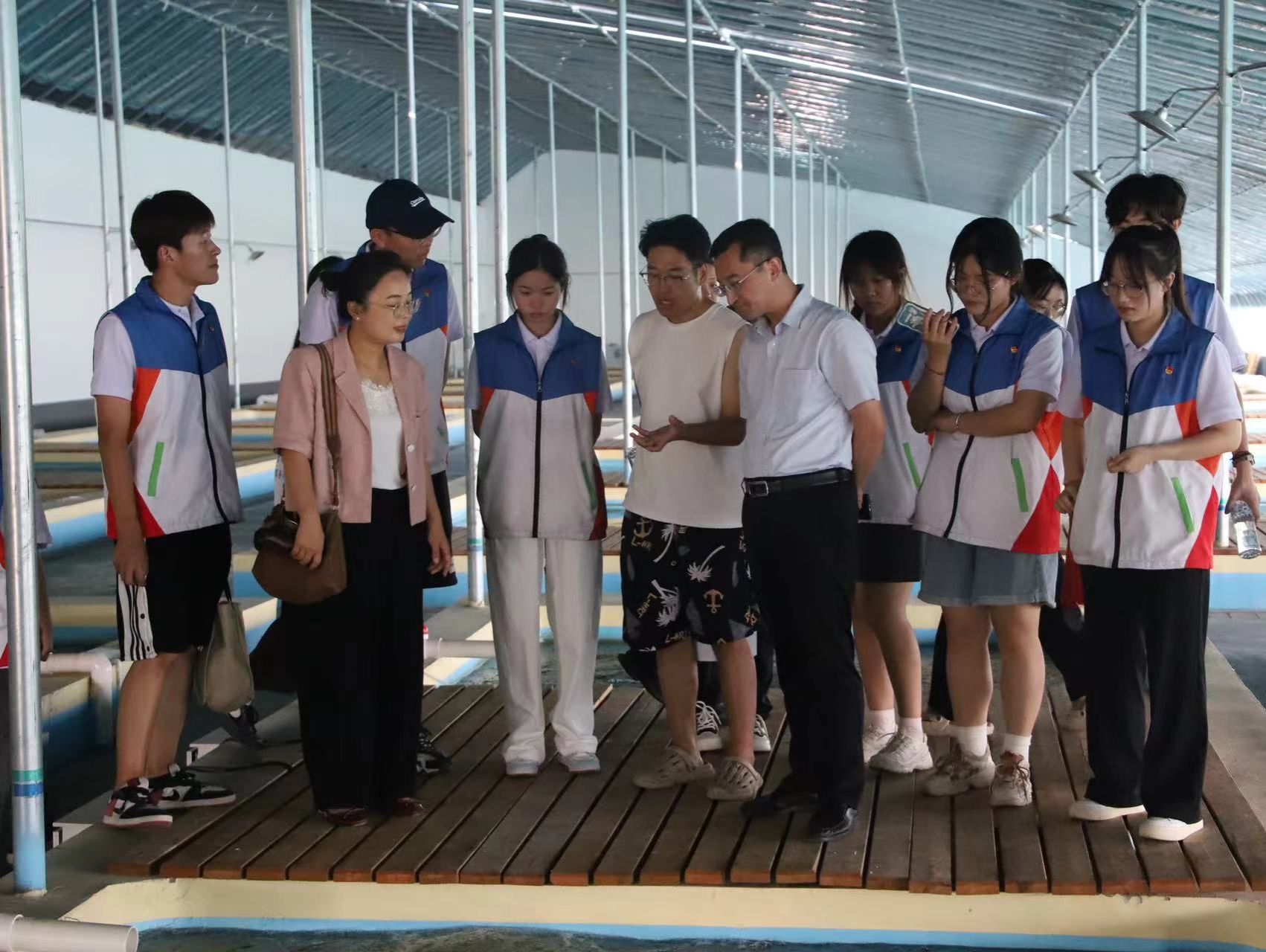 在园区工作人员的引导下,实践团重点参观了占地3000亩的生态渔业片区。该片区主要发展温室锦鲤养殖、工厂化循环水养殖以及稻虾套养、藕鱼共生等新型养殖模式。通过参观学习,实践团了解了鳜鱼如何在标准化智慧养鱼桶所构建的生长环境中有效成长繁殖,以及温室锦鲤的生态适应性、生长周期等,还有相关鱼苗养殖成本、设备投入和预估收益等。通过实地调研,大家进一步掌握了园区的建设理念、发展方向以及在生态渔业领域的创新发展成果,深刻认识到现代农业发展不仅要实现提质增产,更应注重生态保护和文化传承。
