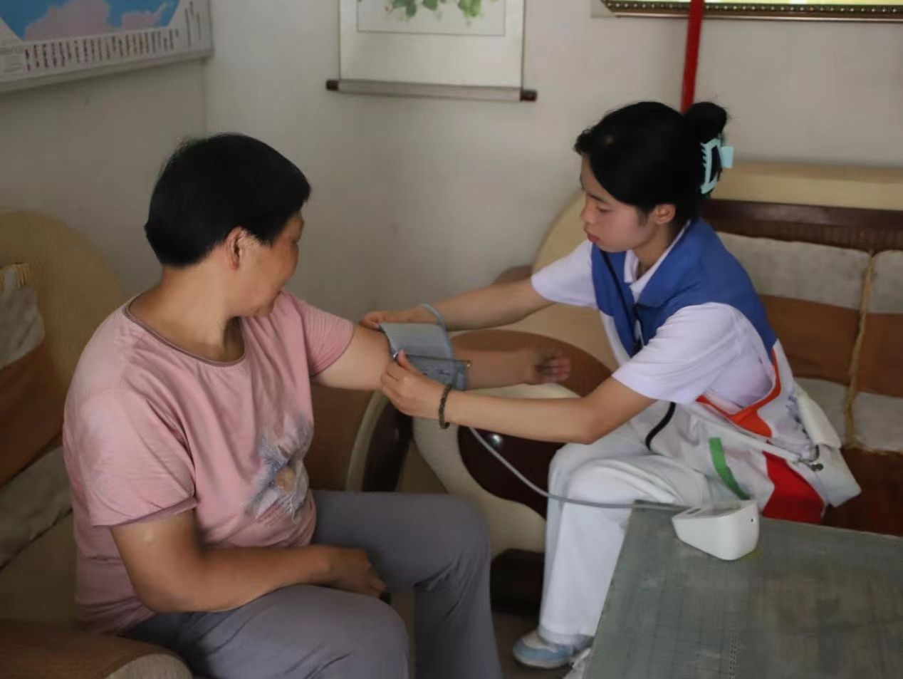 活动伊始,队员们在村长的带领下,有序开展入户为老人量血压、测血糖等医疗服务,为老人提供专业的健康及饮食相关建议,并为他们培训如何扫码观看服务队录制的健康科普视频,以增强老人的健康管理能力。在健康义诊结束后,队员们帮助老人打扫了房间和庭院,并为老人留下了牛奶和生活用品等爱心物资。